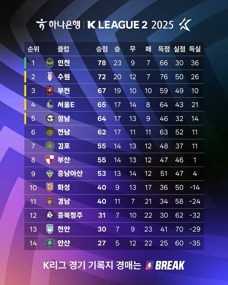[스포츠]2025 K리그2 최종 순위.jpg 작성자탱구|작성시간25.11.27|조회수2,010 목록 댓글 3 글자크기 작게가 글자크기 크게가 다음검색 현재 게시글 추가 기능 열기 북마크 공유하기 신고 센터로 신고 댓글 댓글 3 댓글쓰기 답글쓰기 댓글 리스트 작성자오스먼트 | 작성시간 25.11.27 성남의 막판 대상승세 ㄷㄷ 작성자흑마 | 작성시간 25.11.27 와 다 수도권 작성자carlosslim1 | 작성시간 25.11.27 와 화성 ㄷㄷ 댓글 전체보기