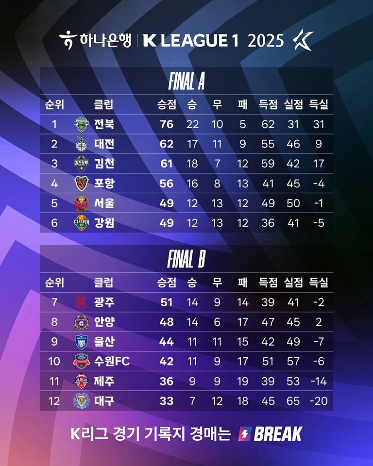 작성자슈퍼콘 작성시간 25.11.29 리그 우승이나 아챔 진출권은 이미 결정나서 상위 스플릿은 쫄리는 경기는 없고 (뭐 물론 아챔2 진출권은 아직 모르긴 한다만)
