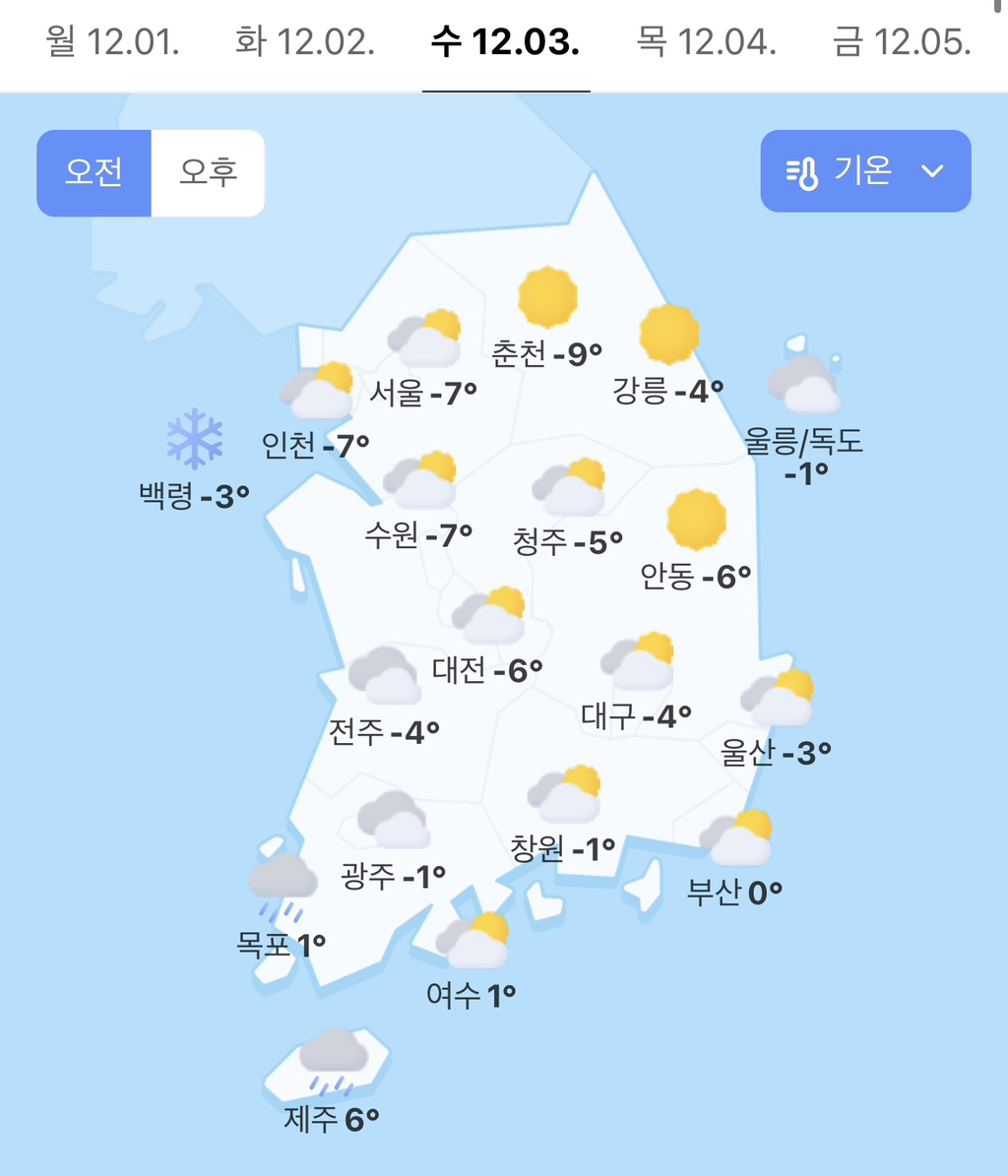 본격적으로 추워지는 다음주 날씨 작성자인천서포터즈|작성시간25.11.30|조회수3,493 목록 댓글 8 글자크기 작게가 글자크기 크게가 다음검색 현재 게시글 추가 기능 열기 북마크 공유하기 신고 센터로 신고 댓글 댓글 8 댓글쓰기 답글쓰기 댓글 리스트 작성자奇誠庸 | 작성시간 25.11.30 12월 되자마자 ㄷㄷ 작성자우정잉5 | 작성시간 25.11.30 차라리 미세먼지 없고 추운게나음 ㅠㅠ 답댓글 작성자맨소래담 | 작성시간 25.11.30 22 작성자갰랍랍 | 작성시간 25.11.30 동장군 ㄷㄷㄷ 작성자한국외국어대학교 | 작성시간 25.11.30 안돼.. 세차 해야하는데(사실 추워도 할 예정) 댓글 전체보기