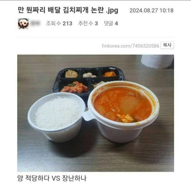 만원 김치찌개 논란 작성자가을날3|작성시간25.12.01|조회수42,260 목록 댓글 9 글자크기 작게가 글자크기 크게가 다음검색 현재 게시글 추가 기능 열기 북마크 공유하기 신고 센터로 신고 댓글 댓글 9 댓글쓰기 답글쓰기 댓글 리스트 작성자바레시 | 작성시간 25.12.01 만원에 배달비까지 포함된건가 작성자전소민 | 작성시간 25.12.01 조금 아쉬움 작성자별나들이 | 작성시간 25.12.01 배달비 포함이면 괜츈 아님 좀 아쉽 작성자Google | 작성시간 25.12.01 요새 배달이면 뭐 작성자풋볼셰프 | 작성시간 25.12.01 고기양 많으면 적당한듯 댓글 전체보기