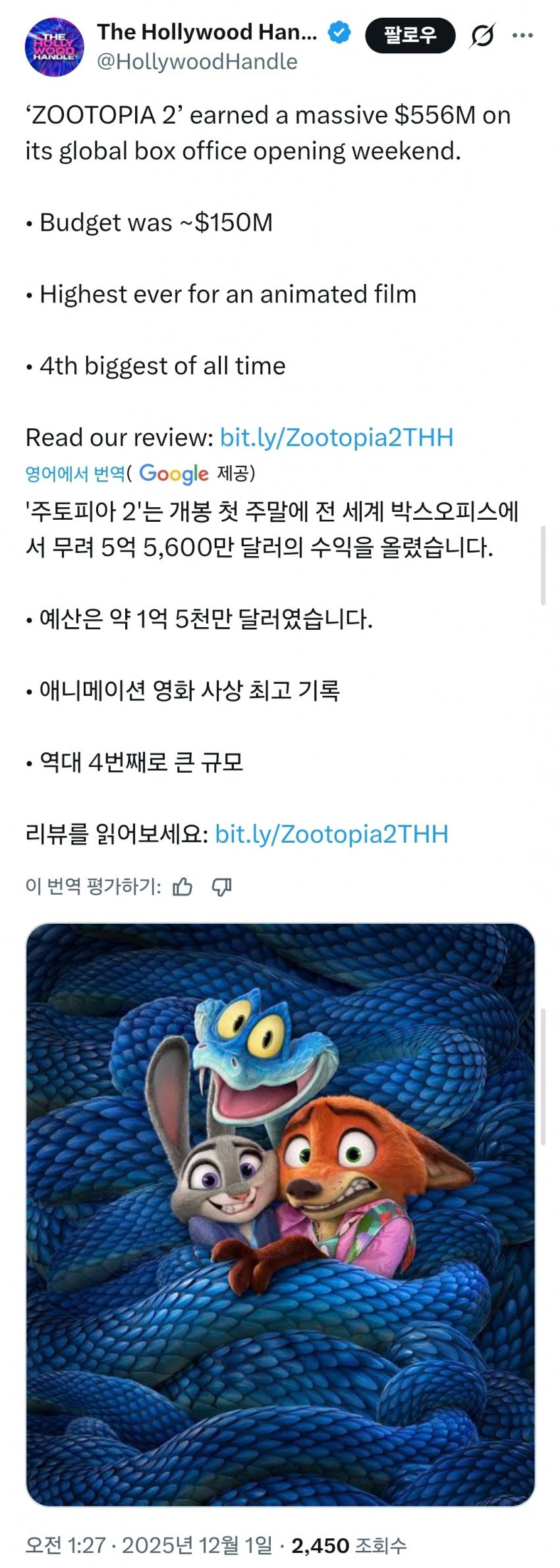 [영화]주토피아2 근황 작성자마일즈 모랄레스|작성시간25.12.01|조회수11,349 목록 댓글 4 글자크기 작게가 글자크기 크게가 애니메이션 역사상 최고기록으로 첫주 스타트 ㄷㄷ 다음검색 현재 게시글 추가 기능 열기 북마크 공유하기 신고 센터로 신고 댓글 댓글 4 댓글쓰기 답글쓰기 댓글 리스트 작성자뿌앵카레 정식 | 작성시간 25.12.01 뱀 목소리 자꾸 스폰지밥 생각남 ㅋㅋㅋ 작성자Saints | 작성시간 25.12.01 쥬디 넘 사랑스러윰 작성자후후!! | 작성시간 25.12.01 재미있었음~ 작성자WingsGoal | 작성시간 25.12.01 게리 너무 귀여워ㅓㅓㅓㅓ 그리고 쿼카도 졸귀탱 댓글 전체보기