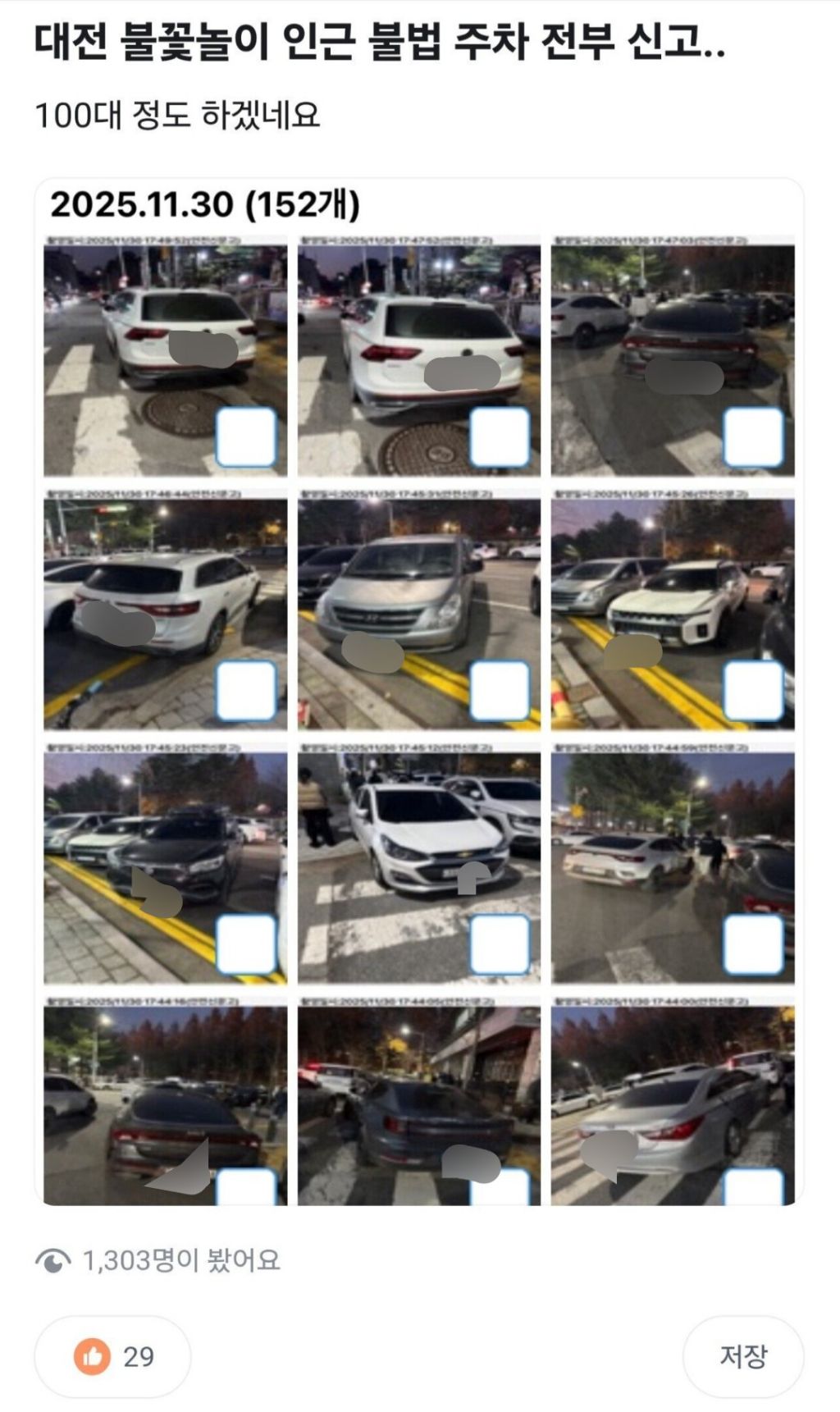 대전 불꽃놀이 가서 불법주차 다 신고한 사람 작성자러바오|작성시간25.12.02|조회수6,101 목록 댓글 3 글자크기 작게가 글자크기 크게가 다음검색 현재 게시글 추가 기능 열기 북마크 공유하기 신고 센터로 신고 댓글 댓글 3 댓글쓰기 답글쓰기 댓글 리스트 작성자코징이 | 작성시간 25.12.02 근데 저날 불법 주차 너무 심각했음 ... 작성자진규형 | 작성시간 25.12.02 개굿.. 돈내야지 작성자시나브로즐거운 | 작성시간 25.12.02 불법주차를 한 것들이 다른 불법주차를 한 것들에게 욕하는 상황이 벌어지는 곳... 댓글 전체보기