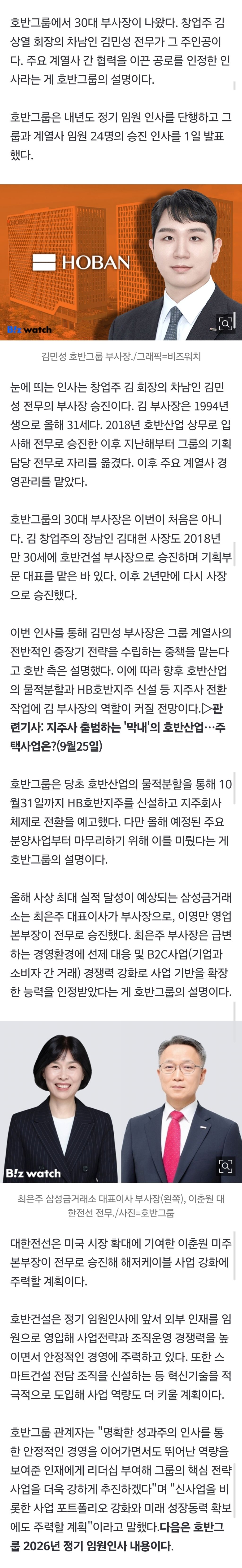 [기사]호반그룹, 94년생 부사장 나왔다…"명확한 성과주의 인사" 작성자Mustard|작성시간25.12.02|조회수11,982 목록 댓글 34 글자크기 작게가 글자크기 크게가 https://n.news.naver.com/mnews/article/648/0000042280?sid=101호반그룹, 94년생 부사장 나왔다…"명확한 성과주의 인사"호반그룹에서 30대 부사장이 나왔다. 창업주 김상열 회장의 차남인 김민성 전무가 그 주인공이다. 주요 계열사 간 협력을 이끈 공로를 인정한 인사라는 게 호반그룹의 설명이다. 호반그룹은 내n.news.naver.com 다음검색 현재 게시글 추가 기능 열기 북마크 공유하기 신고 센터로 신고 댓글 댓글 34 댓글쓰기 답글쓰기 댓글 리스트 작성자아트날 | 작성시간 25.12.02 회장 아들이면 성과 대단한거 맞지 작성자Jose Manuel Reina | 작성시간 25.12.02 멕이는 제목 아닌가ㅋㅋㅋ 작성자짱구는 옷말려 | 작성시간 25.12.02 나와서 ir 발표 시켜봤으면 작성자역시 이불 밖은 위험해 | 작성시간 25.12.02 장남은 사장, 차남은 부사장ㅋㅋ 작성자I.B.I LUV | 작성시간 25.12.02 성과주의는 무슨.... 그냥 승계 하겠다는 빌드업이지.... 빨간 거짓말 좀 그만...... 댓글 전체보기