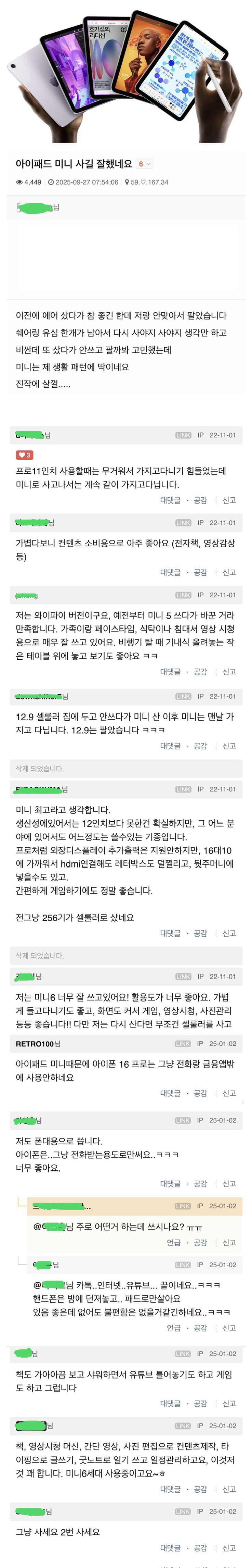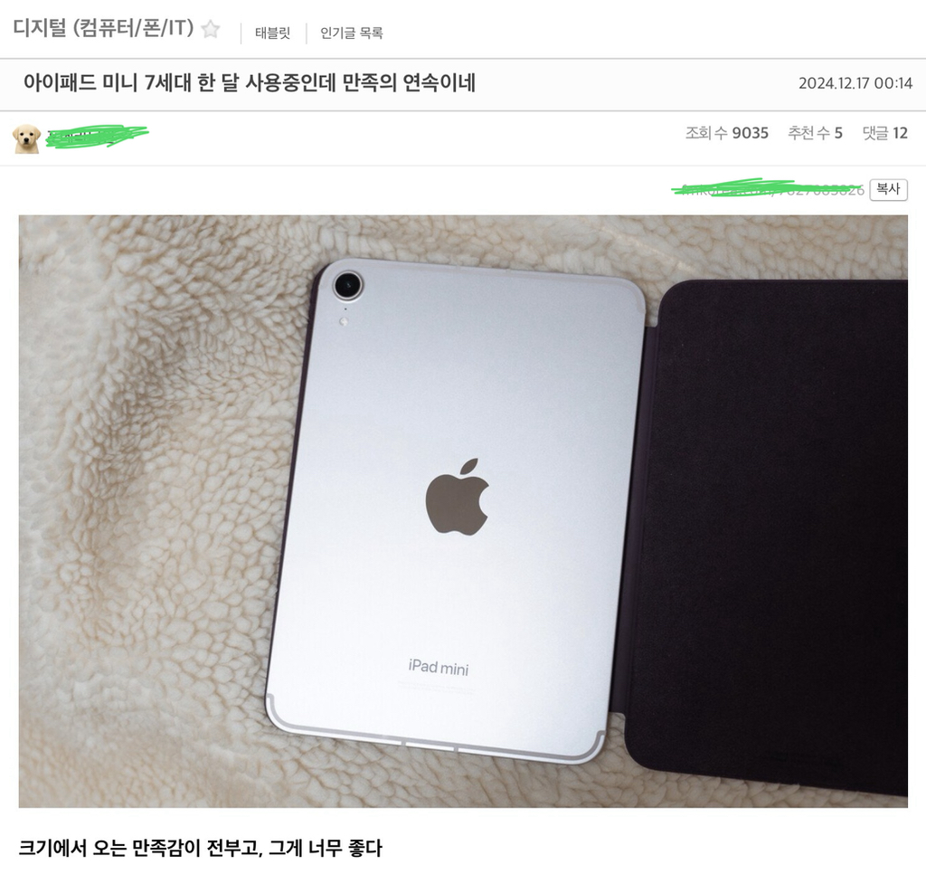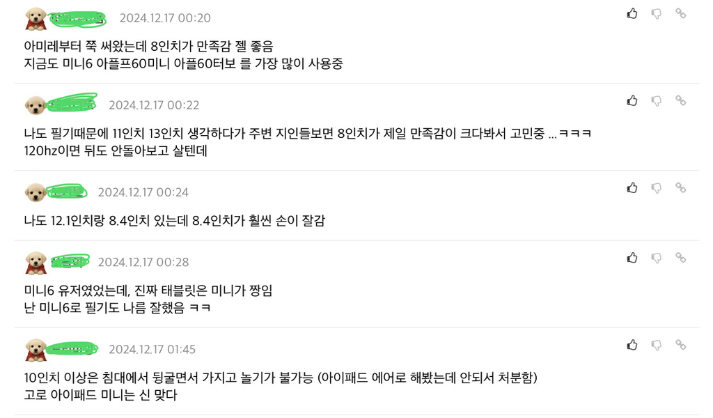 아이패드 다 써본 유튜버들이 선호하는 사이즈 작성자CokeR|작성시간25.12.03|조회수5,175 목록 댓글 5 글자크기 작게가 글자크기 크게가 다음검색 현재 게시글 추가 기능 열기 북마크 공유하기 신고 센터로 신고 댓글 댓글 5 댓글쓰기 답글쓰기 댓글 리스트 작성자tnatropmI | 작성시간 25.12.03 미니 작성자개밥 | 작성시간 25.12.03 미니 너무 작음. 난 아잉패드 프로 11인치가 딱임 작성자내일해야지 | 작성시간 25.12.03 친구보고 미니 사지말고 12.9 사랬는데 친구가 이글 못 보게 해야겠다 작성자Google | 작성시간 25.12.03 11인치가 미쳤음 작성자그로구 | 작성시간 25.12.03 미니6 있고 에어4? 이거맞나 여튼 있는데 에어4가 주력임 너무좋음 ㅜ 댓글 전체보기