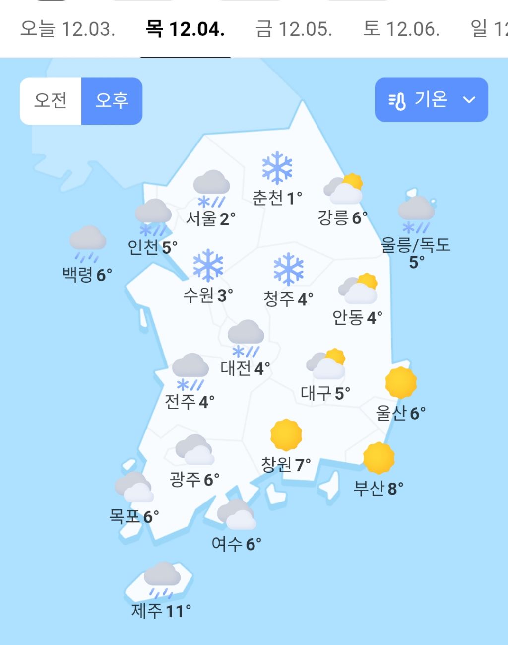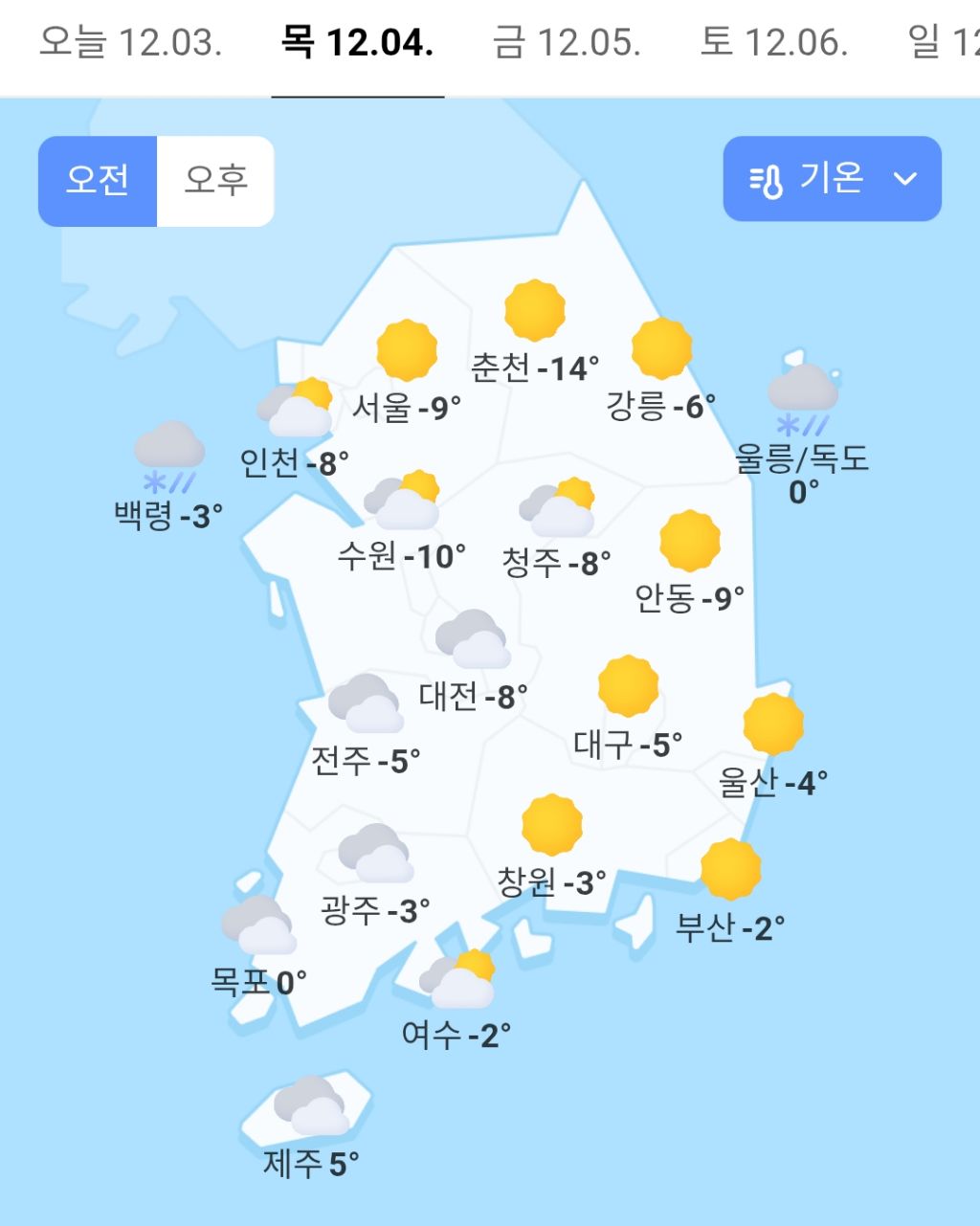 내일 전국 날씨ㄷㄷ 작성자러바오|작성시간25.12.03|조회수20,364 목록 댓글 15 글자크기 작게가 글자크기 크게가 다음검색 현재 게시글 추가 기능 열기 북마크 공유하기 신고 센터로 신고 댓글 댓글 15 댓글쓰기 답글쓰기 댓글 리스트 작성자금요일 | 작성시간 25.12.03 ㄷㄷ 작성자정예린 | 작성시간 25.12.03 작성자헤헤ㅉㅌ | 작성시간 25.12.03 아도빠꺼내야하나 작성자WingsGoal | 작성시간 25.12.03 내일이 더춥네 ㄷㄷㄷ 작성자안내면 쉬얼레 | 작성시간 25.12.04 이제 집에서 나시 못입겠넹 댓글 전체보기