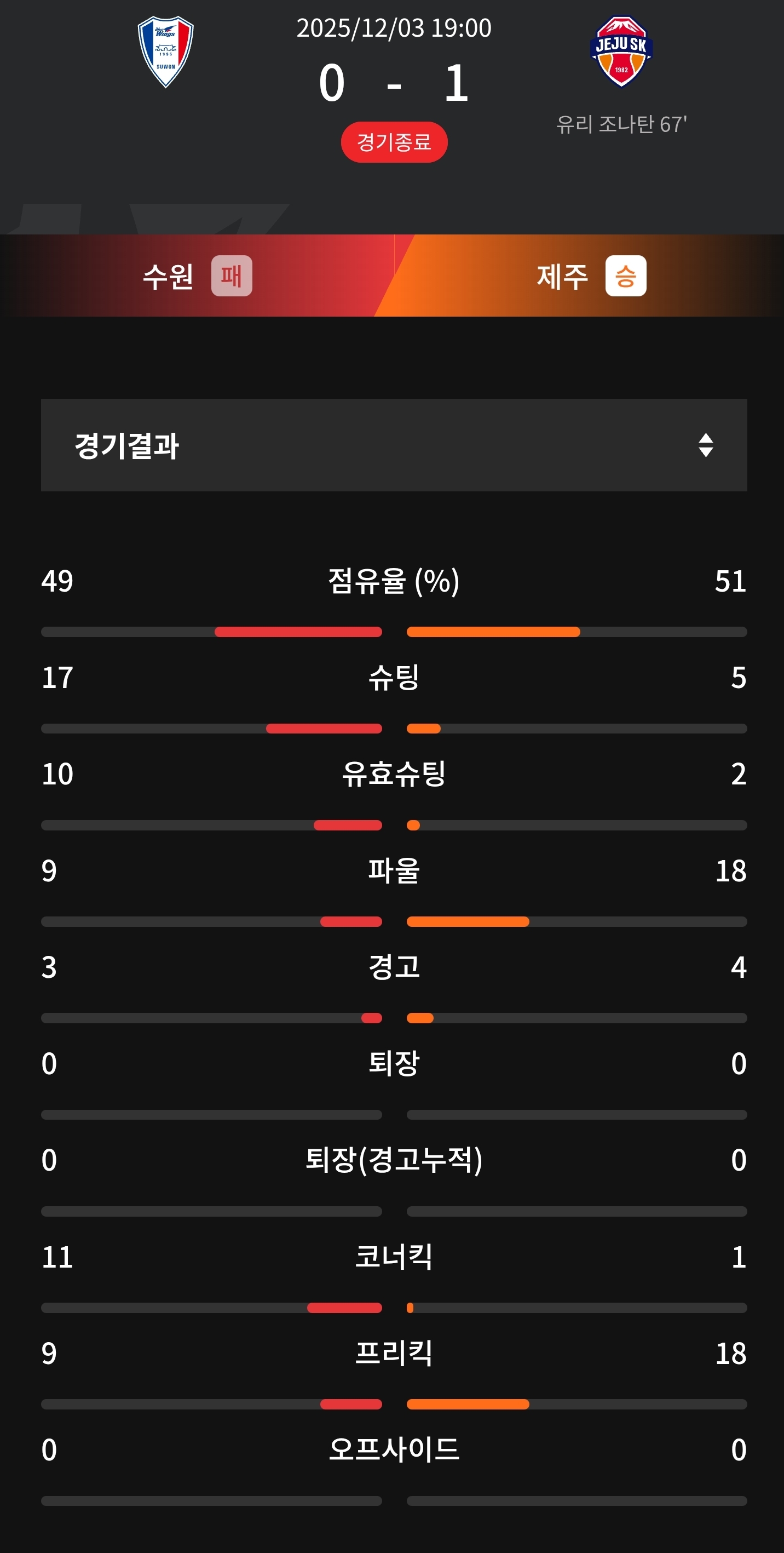 수원vs제주 승강 플레이오프 1차전 결과.jpg 작성자떼아모|작성시간25.12.03|조회수2,139 목록 댓글 4 글자크기 작게가 글자크기 크게가 다음검색 현재 게시글 추가 기능 열기 북마크 공유하기 신고 센터로 신고 댓글 댓글 4 댓글쓰기 답글쓰기 댓글 리스트 작성자오스먼트 | 작성시간 25.12.03 2차전 과연 어떻게 될것인지.. 작성자H_Crespo | 작성시간 25.12.03 17개슛 0골.. 작성자奇誠庸 | 작성시간 25.12.03 작성자축구그잡채 | 작성시간 25.12.03 제주는 2차전 승부보자 였는데 수원골리가 다했지.. 댓글 전체보기