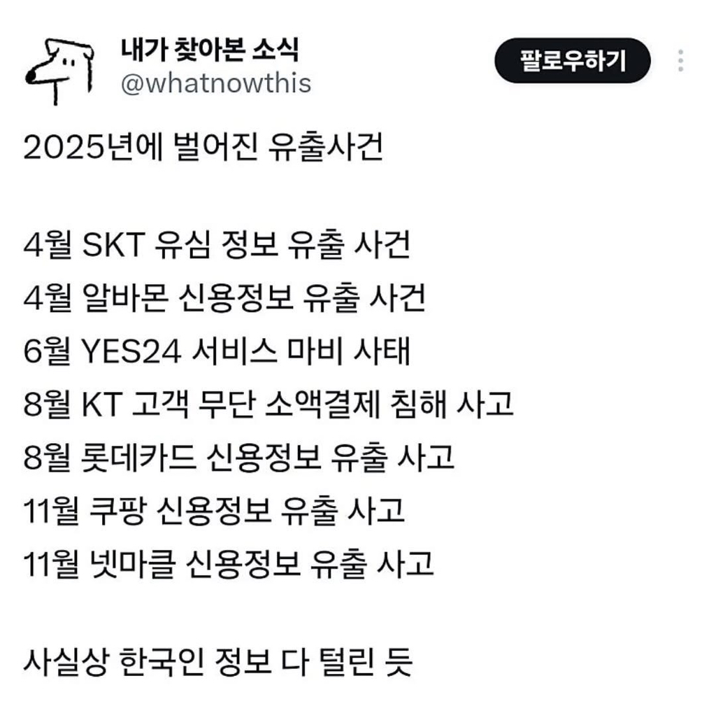 2025년 공공재 되버린 국민들의 개인정보 작성자가을날3|작성시간25.12.03|조회수4,043 목록 댓글 12 글자크기 작게가 글자크기 크게가 다음검색 현재 게시글 추가 기능 열기 북마크 공유하기 신고 센터로 신고 댓글 댓글 12 댓글쓰기 답글쓰기 댓글 리스트 작성자일취월장 | 작성시간 25.12.03 에휴... 작성자톰 스파이더맨 | 작성시간 25.12.03 유플러스도 있지않나요? 작성자I’d rather be ashes than dust | 작성시간 25.12.03 참나 ㅋㅋㅋ 작성자의사능력 | 작성시간 25.12.03 놀라운 건 책임지는 새끼들이 단 하나도 없음 작성자금요일 | 작성시간 25.12.03 ㅠ 댓글 전체보기
