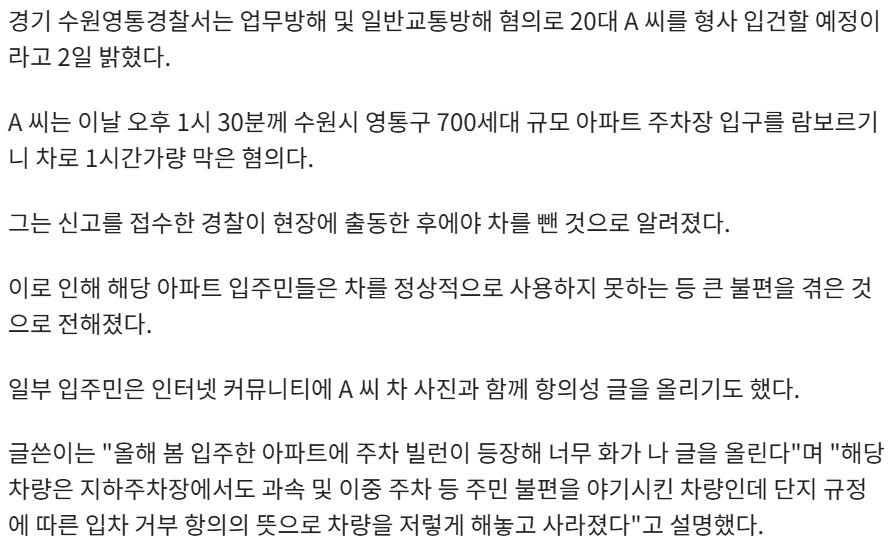 [기사]람보르기니로 아파트 입구 막은 20대 남성 작성자인조인간 17호|작성시간25.12.03|조회수8,758 목록 댓글 6 글자크기 작게가 글자크기 크게가 '람보르기니'로 700세대 아파트 주차장 막은 20대 입주민 - 뉴스1 다음검색 현재 게시글 추가 기능 열기 북마크 공유하기 신고 센터로 신고 댓글 댓글 6 댓글쓰기 답글쓰기 댓글 리스트 작성자지져스 | 작성시간 25.12.03 ㅉㅉ 저렇게 성질못죽이고 살다가 크게 화입는다 작성자지우밍 | 작성시간 25.12.04 그러다 칼 맞고 후회하지 마라 작성자tnatropmI | 작성시간 25.12.04 ㅉㅉ 작성자안녕하 | 작성시간 25.12.04 남들한테 피해 입히지 말고 그냥 빨리 죽어 제발 작성자아메리카노 | 작성시간 25.12.04 일론 머스크 가죽도 사람 가죽인데 칼빵 맞으면 어쩌려고 ㄷㄷ 댓글 전체보기