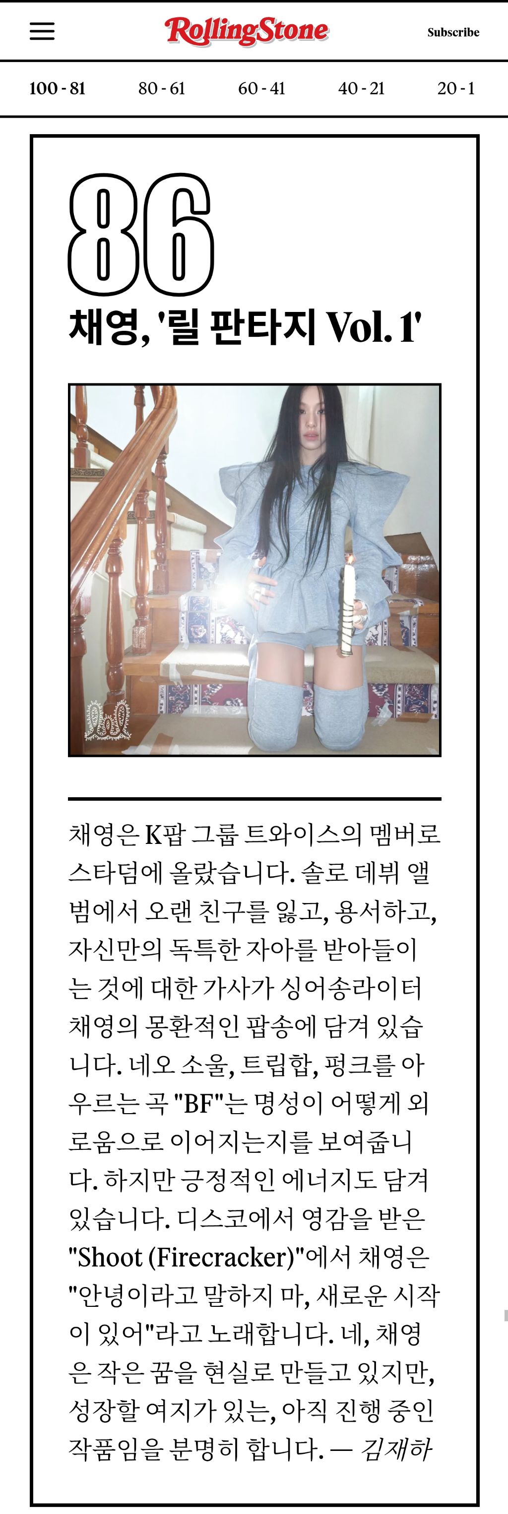 [연예]롤링스톤 선정 '2025년 최고의 앨범 100선' Kpop 걸그룹멤버의 솔로앨범 작성자김지우|작성시간25.12.04|조회수2,306 목록 댓글 3 글자크기 작게가 글자크기 크게가 https://www.rollingstone.com/music/music-lists/best-albums-of-2025-1235466292/amber-mark-pretty-idea-1235466742/ 다음검색 현재 게시글 추가 기능 열기 북마크 공유하기 신고 센터로 신고 댓글 댓글 3 댓글쓰기 답글쓰기 댓글 리스트 작성자Saints | 작성시간 25.12.04 오오 작성자I’d rather be ashes than dust | 작성시간 25.12.04 안녕이라 말하지마 새로운 시작이 있어 작성자똘깅 | 작성시간 25.12.04 솔로 낸지도 몰랐는데 냈구나 댓글 전체보기