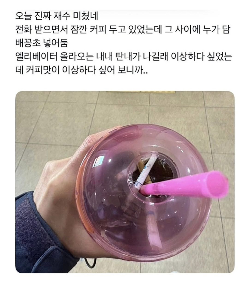 야외에서 커피 함부로 두고 다니면 안되는 이유 작성자가을날3|작성시간25.12.05|조회수7,252 목록 댓글 9 글자크기 작게가 글자크기 크게가 다음검색 현재 게시글 추가 기능 열기 북마크 공유하기 신고 센터로 신고 댓글 댓글 9 댓글쓰기 답글쓰기 댓글 리스트 작성자뿌앵카레 정식 | 작성시간 25.12.05 저거 못잡나 작성자음교수2 | 작성시간 25.12.05 와 뭔 무개념이야 진짜 작성자대한민국 축구 국가대표팀 | 작성시간 25.12.05 헐 작성자보건복지부 | 작성시간 25.12.05 폐암걸려야 되는 놈들 작성자Ronaldo | 작성시간 25.12.05 역시... 댓글 전체보기