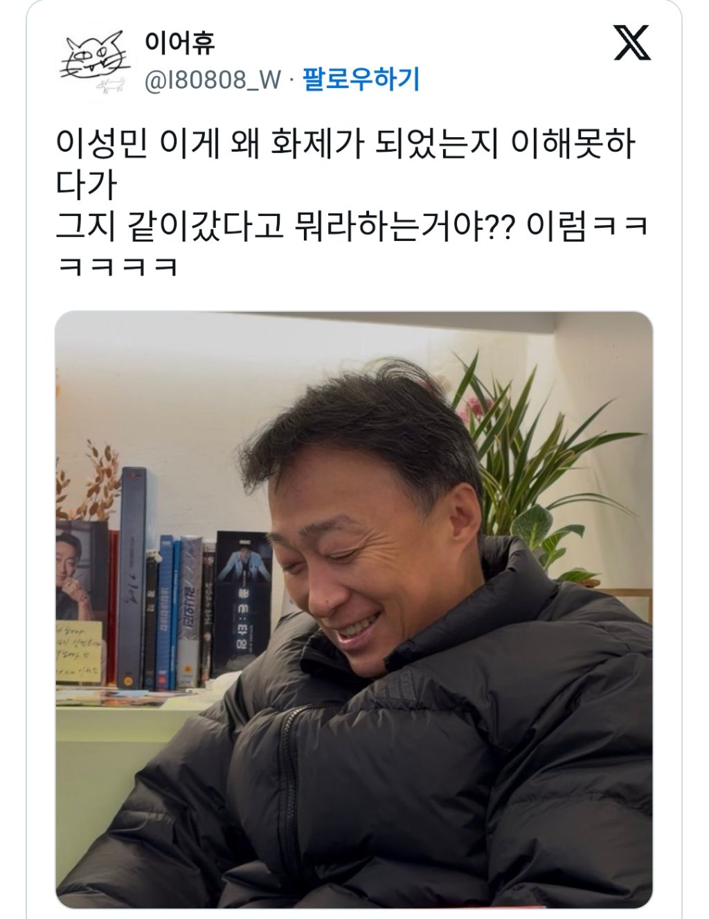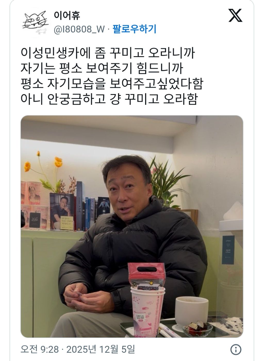 배우 이성민이 생카에 안 꾸미고 오는 이유 작성자러바오|작성시간25.12.05|조회수12,898 목록 댓글 19 글자크기 작게가 글자크기 크게가 https://x.com/I80808_W/status/1996738521789616386 다음검색 현재 게시글 추가 기능 열기 북마크 공유하기 신고 센터로 신고 댓글 댓글 19 댓글쓰기 답글쓰기 댓글 리스트 작성자권석진 | 작성시간 25.12.05 ㅋㅋㅋㅋㅋㅋㅋㅋㅋ 작성자니하는플레이보이 | 작성시간 25.12.05 진짜 그냥 동네 아저씨 ㅋㅋㅋㅋ 작성자무무링 | 작성시간 25.12.05 안 궁금하대 ㅋㅋㅋㅋㅋㅋㅋㅋ 작성자REAL | 작성시간 25.12.05 이성민 좋아하면 드라마 골든타임 꼭 보세요! 작성자이나경 | 작성시간 25.12.05 ㅋㅋㅋㅋㅋㅋㅋ 댓글 전체보기