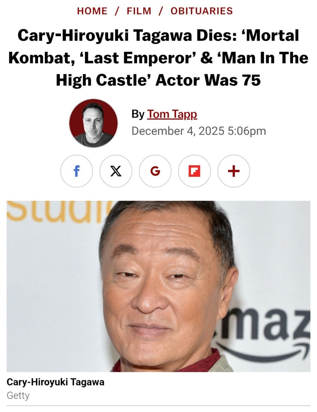 [영화]헐리웃에서 동양인 악역 전문 배우로 유명하셨던 캐리 히로유키 타가와 옹께서 타계 하셨습니다. 작성자음교수2|작성시간25.12.06|조회수7,977 목록 댓글 7 글자크기 작게가 글자크기 크게가 향년 75세내 세대는 리틀 도쿄의 야쿠자 두목으로 유명했던대표작으로는 모탈컴뱃, 리틀 도쿄, 마지막 황제,높은 성의 사나이, 진주만, 게이샤의 추억등등삼가 고인의 명복을 빕니다. 다음검색 현재 게시글 추가 기능 열기 북마크 공유하기 신고 센터로 신고 댓글 댓글 7 댓글쓰기 답글쓰기 댓글 리스트 작성자Modagitbe | 작성시간 25.12.06 삼가 고인의 명복을 빕니다 작성자이나경 | 작성시간 25.12.06 삼가 고인의 명복을 빕니다 작성자슈바인슈타이거 | 작성시간 25.12.06 삼가 고인의 명복을 빕니다. 작성자말장난 | 작성시간 25.12.06 삼가 고인의 명복을 빕니다 작성자인기폭발 | 작성시간 25.12.06 삼가 고인의 명복을 빕니다 댓글 전체보기
