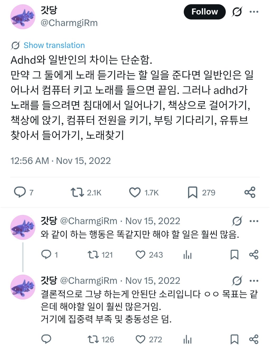 답댓글 작성자소녀시대 윤아 작성시간 25.12.06 그러니까 일반인들은 컴퓨터 키고 유튜브 키고 노래트는거까지가 하나의 행동이라면 adhd는 저게 나눠서 하는 행동이라는거죠 저 사이 사이에 다른걸 하면 노래트는걸 까먹기도 하고 그런거일듯요