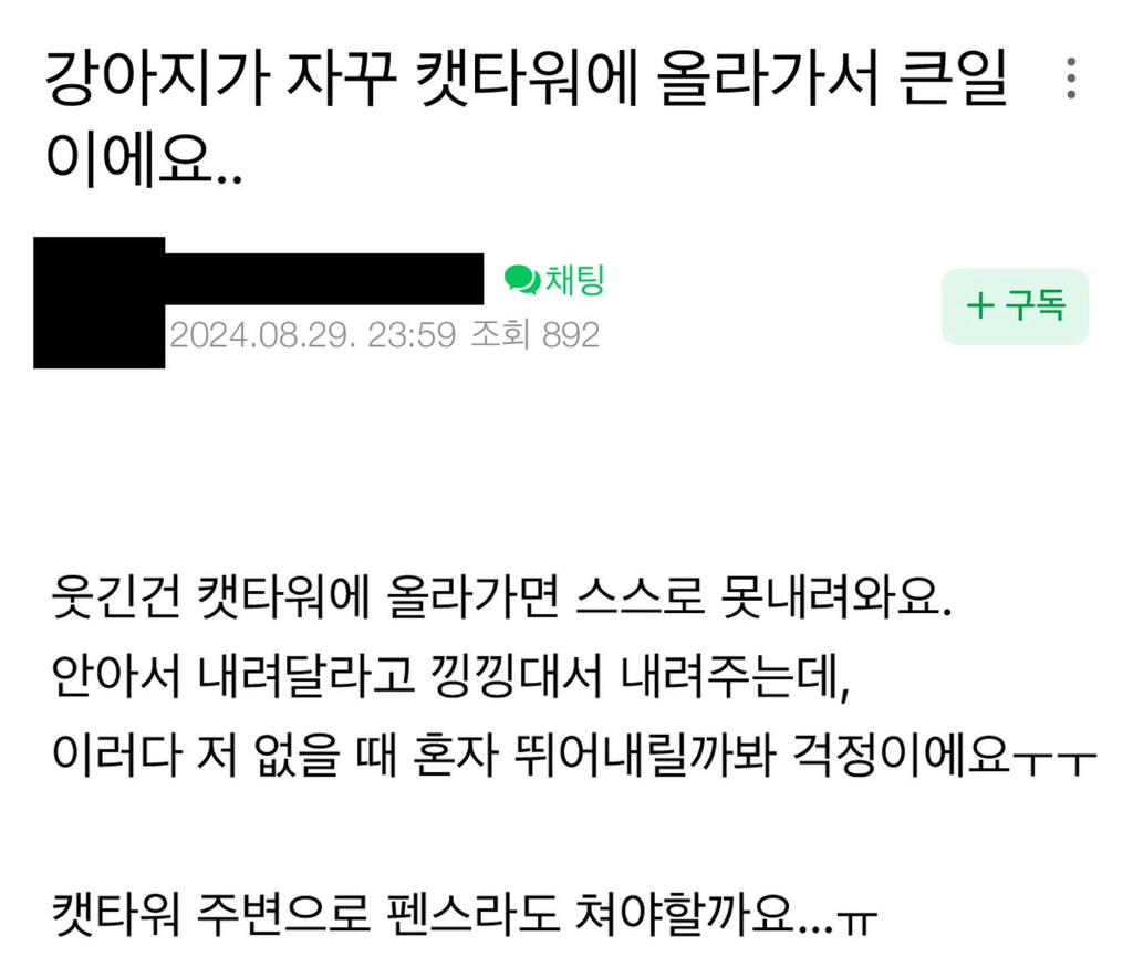 강아지가 자꾸 캣타워에 올라가서 큰일이에요 작성자가을날3|작성시간25.12.07|조회수3,070 목록 댓글 7 글자크기 작게가 글자크기 크게가 다음검색 현재 게시글 추가 기능 열기 북마크 공유하기 신고 센터로 신고 댓글 댓글 7 댓글쓰기 답글쓰기 댓글 리스트 작성자림프비스킷 | 작성시간 25.12.07 냥이도 늠름하네 ㅋㅋㅋ 작성자이나경 | 작성시간 25.12.07 ㅋㅋㅋㅋㅋㅋㅋㅋ 작성자로또1등백수 | 작성시간 25.12.07 귀엽네 작성자흥민쓰 | 작성시간 25.12.07 너무 행복해하는데ㅋㅋㅋㅋㅋㅋ 작성자밀키스 | 작성시간 25.12.07 아진짜 넘 귀엽다 ㅜ 댓글 전체보기