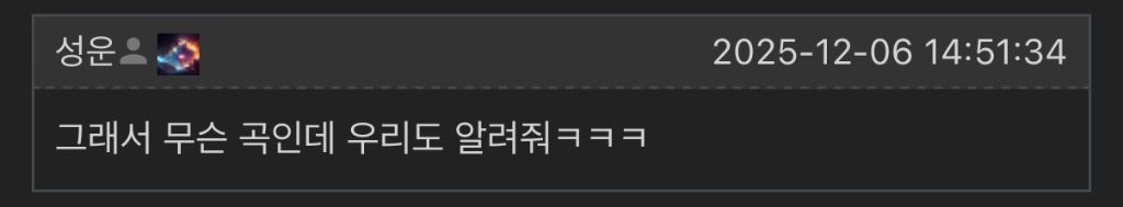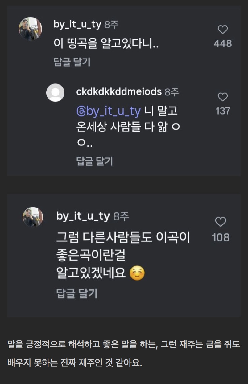 돈을 줘도 배우지 못하는 재능 작성자러바오|작성시간25.12.07|조회수7,753 목록 댓글 4 글자크기 작게가 글자크기 크게가 다음검색 현재 게시글 추가 기능 열기 북마크 공유하기 신고 센터로 신고 댓글 댓글 4 댓글쓰기 답글쓰기 댓글 리스트 작성자림프비스킷 | 작성시간 25.12.07 무슨 곡인지 아시는 분 ㅠㅠ 작성자아메리카노 | 작성시간 25.12.07 알려줘 작성자Tensegrity Universe and Philosophy | 작성시간 25.12.07 곡이름은 이띵 이라고 하네요. 작성자윤태진 | 작성시간 25.12.07 뭐야 우리도 알려줘여 댓글 전체보기
