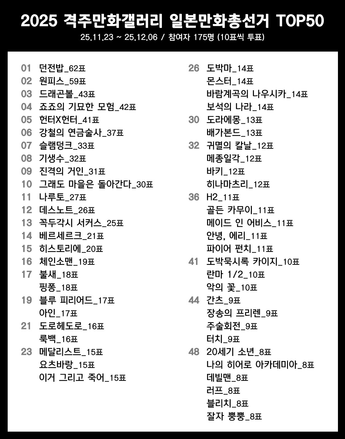 디시 만화 갤러리 일본만화 인기투표 TOP50 작성자ChatGPT|작성시간25.12.07|조회수3,606 목록 댓글 18 글자크기 작게가 글자크기 크게가 다음검색 현재 게시글 추가 기능 열기 북마크 공유하기 신고 센터로 신고 댓글 댓글 18 댓글쓰기 답글쓰기 댓글 리스트 답댓글 작성자바레시 | 작성시간 25.12.07 이스카리온 글쿤요... 늙었나 보이지도 않네요ㅋㅋ 그럼 그렇지 작성자베니테즈 | 작성시간 25.12.07 코난이 없다니 작성자코비올라 | 작성시간 25.12.07 던전밥이 1위...? 확실히 재밌긴 한데 작성자kkn2258 | 작성시간 25.12.08 일본만화 작성자Cody Rhodes | 작성시간 25.12.08 터치가 저거밖에 안돼? 댓글 전체보기