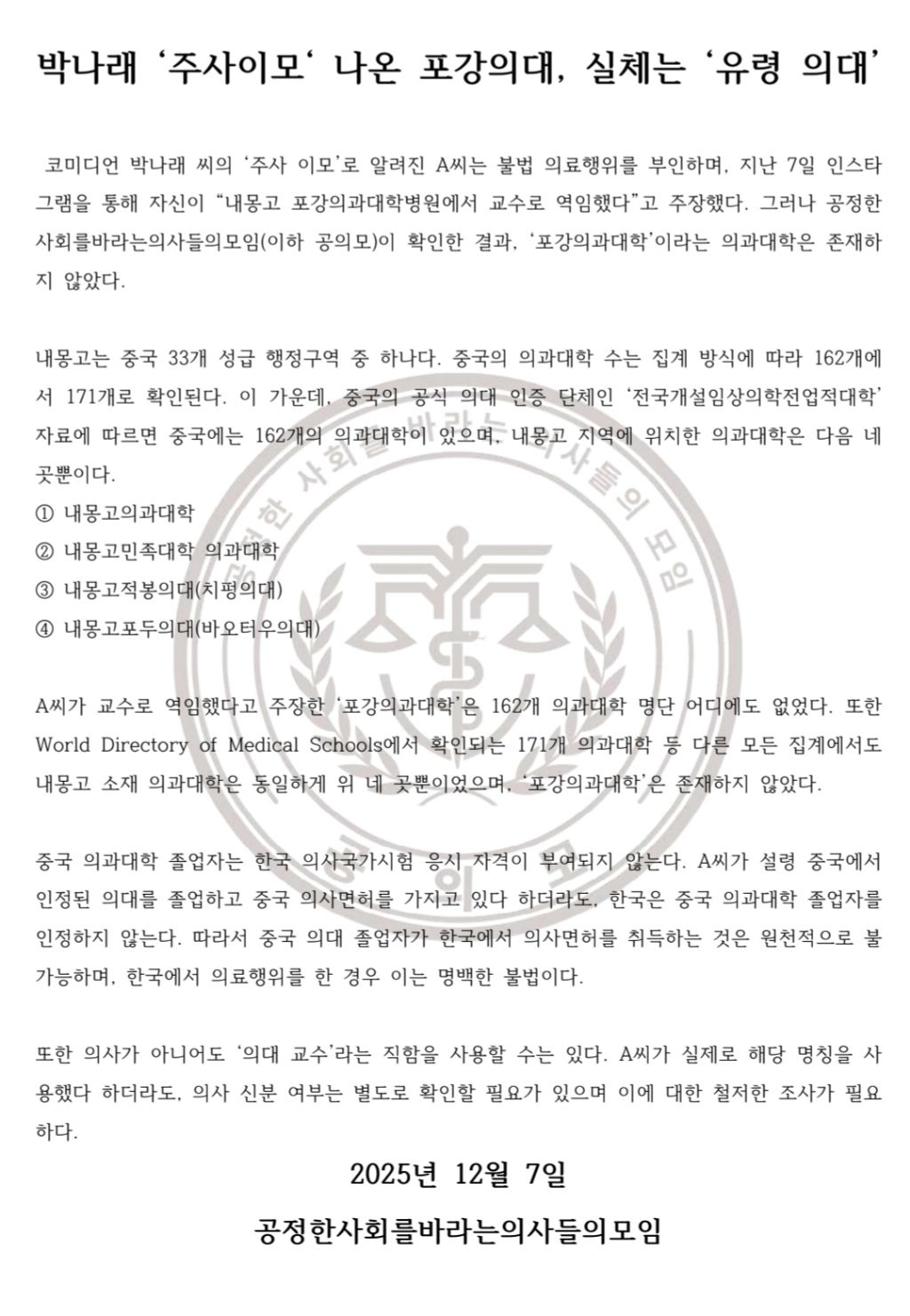 의사단체...박나래 '주사이모' 나온 포강의대, 실체는 '유령 의대' 작성자난누군가또여긴어딘가.|작성시간25.12.08|조회수9,324 목록 댓글 2 글자크기 작게가 글자크기 크게가 다음검색 현재 게시글 추가 기능 열기 북마크 공유하기 신고 센터로 신고 댓글 댓글 2 댓글쓰기 답글쓰기 댓글 리스트 작성자주ㅕ니애비 | 작성시간 25.12.08 박나래의 행간을 뭐랄까 전부다 까발리는 느낌? 이러다가 극단적인 행동할까봐 겁남.... 작성자독거노인 | 작성시간 25.12.08 나래야 고만하자 너무 멀리왓다 하이고 댓글 전체보기