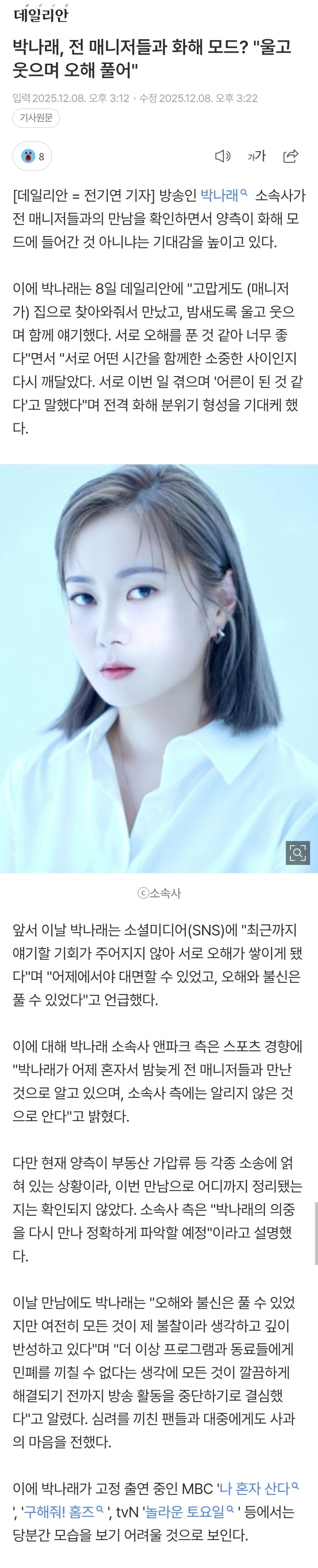 [연예]박나래, 전 매니저들과 화해 모드? "울고 웃으며 오해 풀어" 작성자럭키럭키|작성시간25.12.08|조회수28,113 목록 댓글 25 글자크기 작게가 글자크기 크게가 https://m.entertain.naver.com/home/article/119/0003034415박나래, 전 매니저들과 화해 모드? "울고 웃으며 오해 풀어"여기를 눌러 링크를 확인하세요m.entertain.naver.com매니저 갑질은 합의 했으나주사이모는 아직 수사중 다음검색 현재 게시글 추가 기능 열기 북마크 공유하기 신고 센터로 신고 댓글 댓글 25 댓글쓰기 답글쓰기 댓글 리스트 작성자Jordan | 작성시간 25.12.08 일 마무리했어요쉬다올게요이런 느낌이네흠 작성자이지금아이유 | 작성시간 25.12.08 주사이모가 더 큰 문제인데 작성자asapasap | 작성시간 25.12.08 주사이모는 합의로 안될텐데 작성자디지몬 | 작성시간 25.12.08 주사이모는 조사하면 몇 명 쓸려갈듯 작성자yunalove | 작성시간 25.12.08 고소한대더니 만나보니까 저쪽 무기가 더 컸나보네 댓글 전체보기