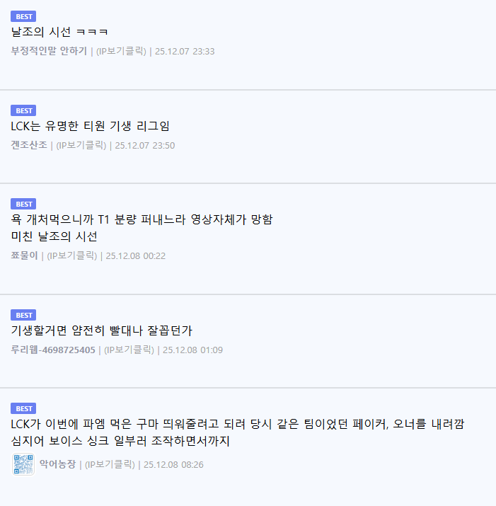 답댓글 작성자마일즈 모랄레스 작성시간 25.12.09 원래 저런놈들이긴해요 한창 페이커 죽이기하고 쇼메이커띄울때도 페이카 왕의귀환 ^아니고^ 새로운왕의탄생 이딴식으로해서 팬들 뒷목잡고 쓰러지게만들던 놈들이라