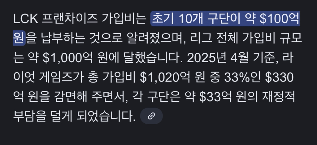 LCK의 팀 프랜차이즈 가입 비용은....
