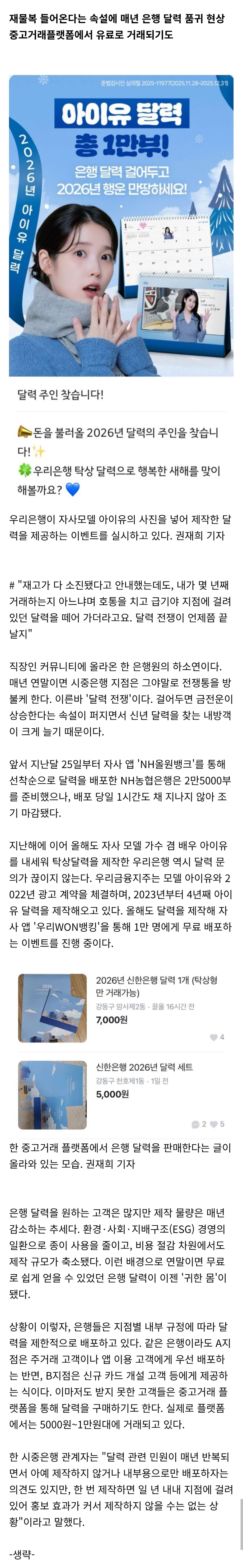[기사]"돈 들어온대" 아이유 찾아 삼만리…"내가 여기 몇 년 고객인줄 알아?" 은행은 전쟁중 작성자럭키럭키|작성시간25.12.10|조회수5,966 목록 댓글 1 글자크기 작게가 글자크기 크게가 https://n.news.naver.com/mnews/article/277/0005691279"돈 들어온대" 아이유 찾아 삼만리…"내가 여기 몇 년 고객인줄 알아?" 은행은 전쟁중# "재고가 다 소진됐다고 안내했는데도, 내가 몇 년째 거래하는지 아느냐며 호통을 치고 급기야 지점에 걸려 있던 달력을 떼어 가더라고요. 달력 전쟁이 언제쯤 끝날지" 직장인 커뮤니티에 올라n.news.naver.com 다음검색 현재 게시글 추가 기능 열기 북마크 공유하기 신고 센터로 신고 댓글 댓글 1 댓글쓰기 답글쓰기 댓글 리스트 작성자인유특전대 | 작성시간 25.12.10 무속의 나라구만 댓글 전체보기