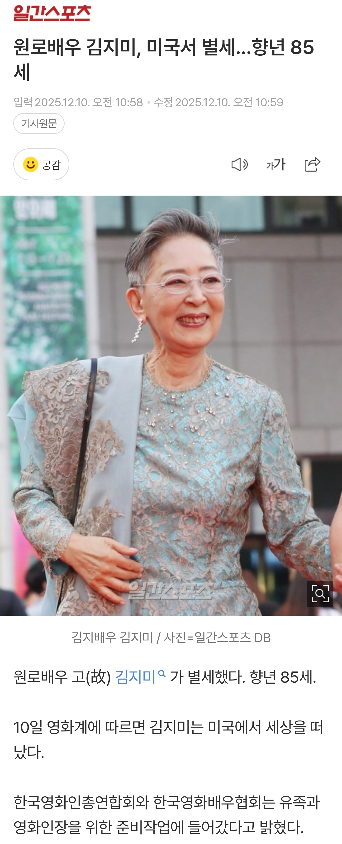 [연예]원로배우 김지미, 미국서 별세…향년 85세 작성자뷔정국진지민|작성시간25.12.10|조회수9,748 목록 댓글 27 글자크기 작게가 글자크기 크게가 https://naver.me/GreknIxr원로배우 김지미, 미국서 별세…향년 85세여기를 눌러 링크를 확인하세요link.naver.com 다음검색 현재 게시글 추가 기능 열기 북마크 공유하기 신고 센터로 신고 댓글 댓글 27 댓글쓰기 답글쓰기 댓글 리스트 작성자마이클캐릭 | 작성시간 25.12.10 삼가 고인의 명복을 빕니다. 작성자김재환 | 작성시간 25.12.10 삼가 고인의 명복을 빕니다 작성자드리쁠러 | 작성시간 25.12.10 삼가 고인의 명복을 빕니다. 작성자데이모르 | 작성시간 25.12.10 고인의 명복을 빕니다 작성자별빛사냥꾼 | 작성시간 25.12.10 삼가 고인의 명복을 빕니다. 댓글 전체보기