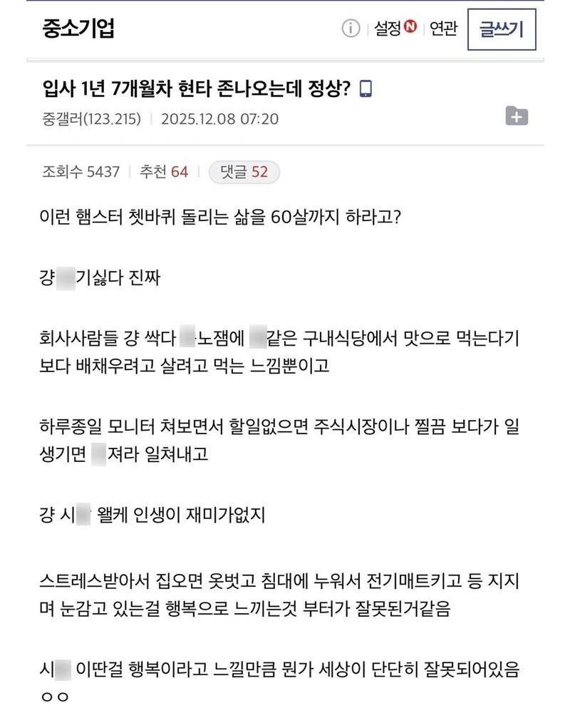 작성자구탱이형 작성시간 25.12.11 공감 근데 어쩔수없지 그게 싫으면 퇴사하거나 알바하면서 살아야함 그럴거아니면 저렇게살아야지뭐