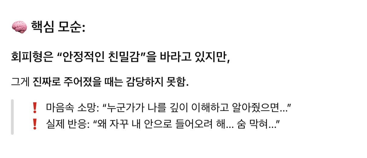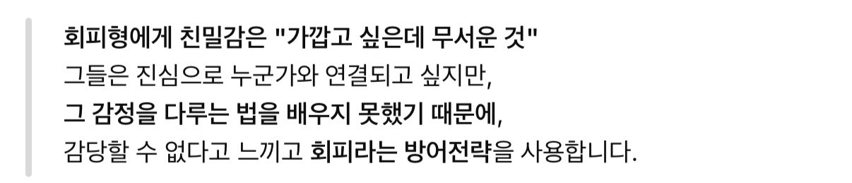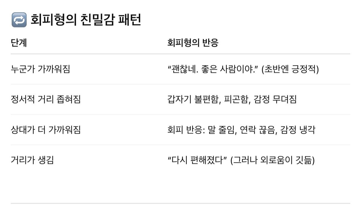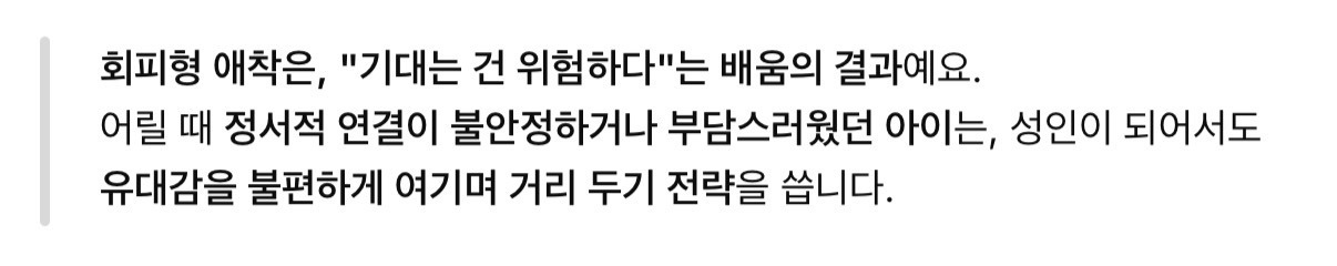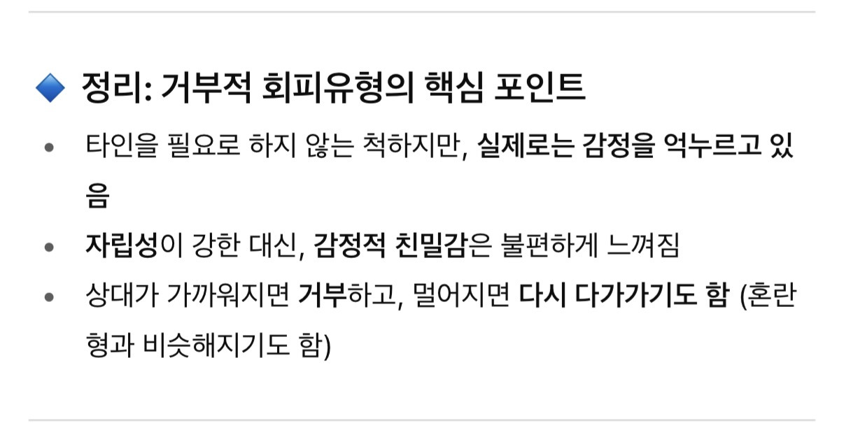 실제로 친구, 애인한테 갑작스럽게 거리감이 느껴지거나 잠수를 탄다거나, 일방적인 손절을 당했다면 그 사람은 ‘거부적 회피유형’일 확률이 매우 높음