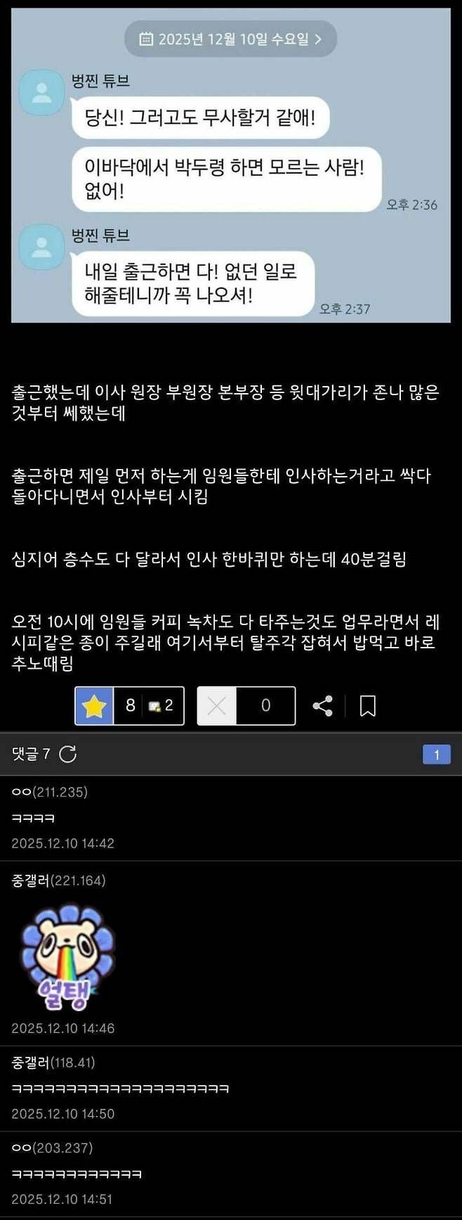 중소기업 갔다가 도망간 후 받은 카톡 작성자하얀마음흑구|작성시간25.12.12|조회수8,414 목록 댓글 4 글자크기 작게가 글자크기 크게가 감히 두령님 앞에서 도망치다니 다음검색 현재 게시글 추가 기능 열기 북마크 공유하기 신고 센터로 신고 댓글 댓글 4 댓글쓰기 답글쓰기 댓글 리스트 작성자kaka | 작성시간 25.12.12 밭두렁 모르는 사람 없긴 하지 작성자축구공 | 작성시간 25.12.12 별생각없으면 꿀 같기도 작성자Tensegrity Universe and Philosophy | 작성시간 25.12.12 산적들인가? 작성자닭둘킹 | 작성시간 25.12.12 ㅋㅋㅋㅋ 저팔계인가 말투가 ~셔체인게 존웃 댓글 전체보기