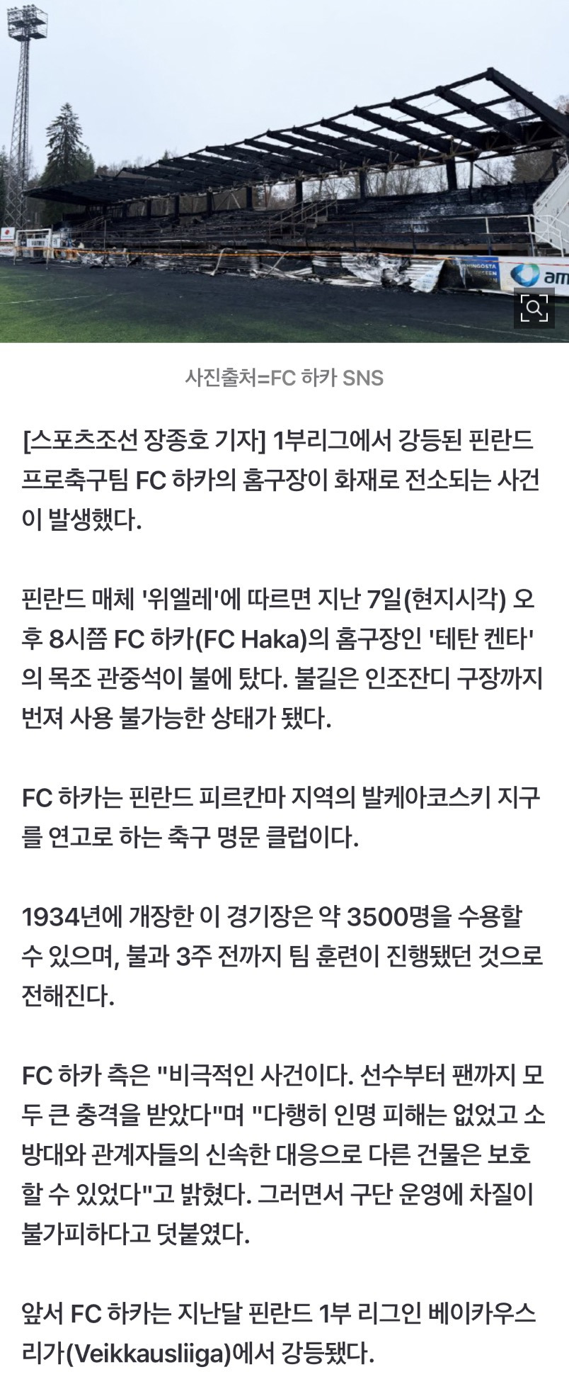樂soccer [축구기사]1부리그 강등 후 프로축구팀 홈구장 화재…방화 가능성 제기 작성시간25.12.14|조회수5,054 목록 댓글 9 글자크기 작게가 글자크기 크게가 https://n.news.naver.com/article/076/0004354980?sid=1021부리그 강등 후 프로축구팀 홈구장 화재…방화 가능성 제기1부리그에서 강등된 핀란드 프로축구팀 FC 하카의 홈구장이 화재로 전소되는 사건이 발생했다. 핀란드 매체 '위엘레'에 따르면 지난 7일(현지시각) 오후 8시쯤 FC 하카(FC Haka)의 홈구장인 '테탄 켄n.news.naver.com 다음검색 현재 게시글 추가 기능 열기 북마크 공유하기 신고 센터로 신고 댓글 9 댓글 리스트 작성시간 25.12.14 10대 세명이 불지름ㅡㅡㅋ 작성시간 25.12.14 ㄷㄷㄷ 작성시간 25.12.14 ㄷㄷㄷ 작성시간 25.12.14 헉 작성시간 25.12.14 구장 망가져서 어쩌냐......;; 카페 방문해 더 많은 댓글 만나기!