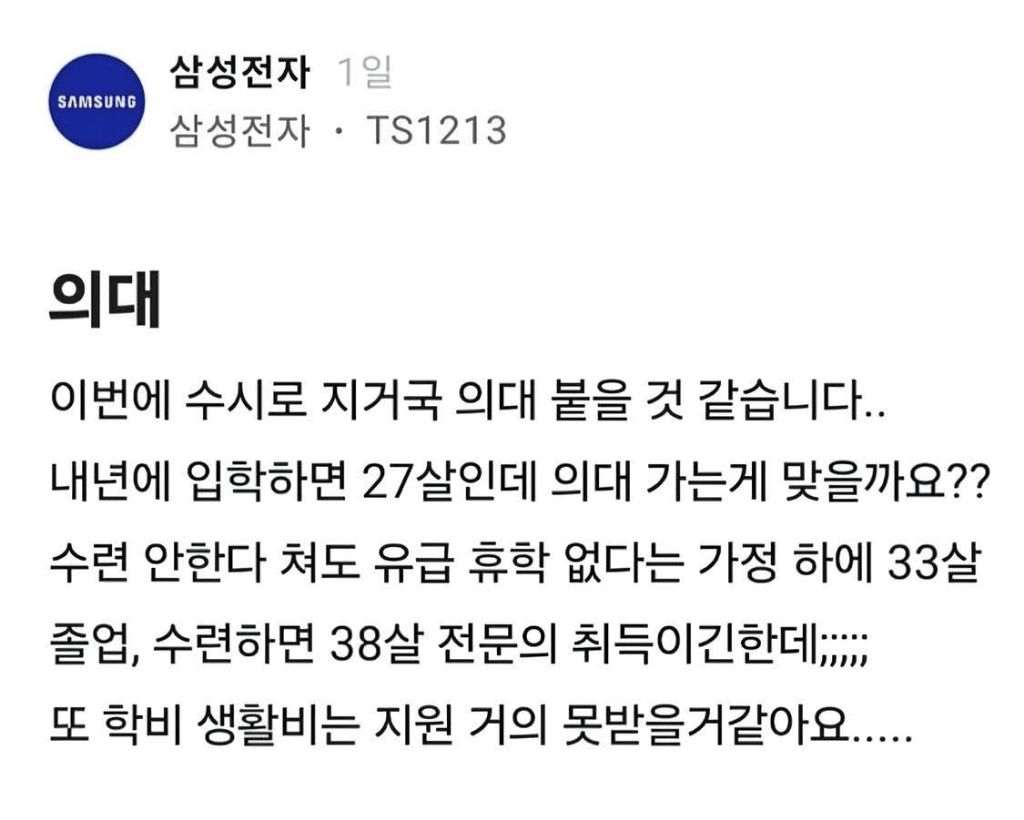 [기타]수시로 의대붙어서 고민하는 삼성직원 작성자음교수2|작성시간25.12.14|조회수95,243 목록 댓글 24 글자크기 작게가 글자크기 크게가 다음검색 현재 게시글 추가 기능 열기 북마크 공유하기 신고 센터로 신고 댓글 댓글 24 댓글쓰기 답글쓰기 댓글 리스트 작성자가보자귱 | 작성시간 25.12.14 무조건감 작성자플레이오프 | 작성시간 25.12.14 임원가더라도 정년 생각하면 의사가 훨 낫죠 ㅋㅋ 작성자아저씨 | 작성시간 25.12.14 이걸 안 가? 작성자끝판대장부폰 | 작성시간 25.12.14 정년생각하면 의사가 맞는듯 작성자심수봉 | 작성시간 25.12.14 결혼햇으면 고민될듯 댓글 전체보기