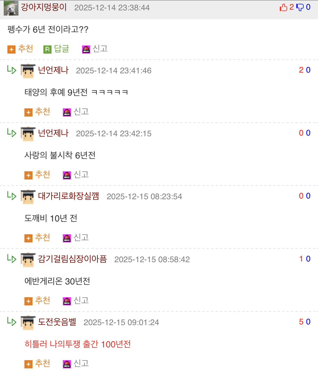 세월을 느끼게 하는 짤.jpg 작성자Google|작성시간25.12.15|조회수5,636 목록 댓글 8 글자크기 작게가 글자크기 크게가 https://humoruniv.com/pds1393307 다음검색 현재 게시글 추가 기능 열기 북마크 공유하기 신고 센터로 신고 댓글 댓글 8 댓글쓰기 답글쓰기 댓글 리스트 답댓글 작성자Noel Gallagher | 작성시간 25.12.15 정확히는 2029년 전 작성자주ㅕ니애비 | 작성시간 25.12.15 도깨비가 10년전이야? ㅋㅋㅋㅋ 개충격적이네 작성자은하 | 작성시간 25.12.15 단군 고조선 건국 2025+2333년 전 작성자한국외국어대학교 | 작성시간 25.12.15 6개월 뒤, 손흥민 유로파 우승 1년 작성자Alexis Sanchez | 작성시간 25.12.15 헉 댓글 전체보기