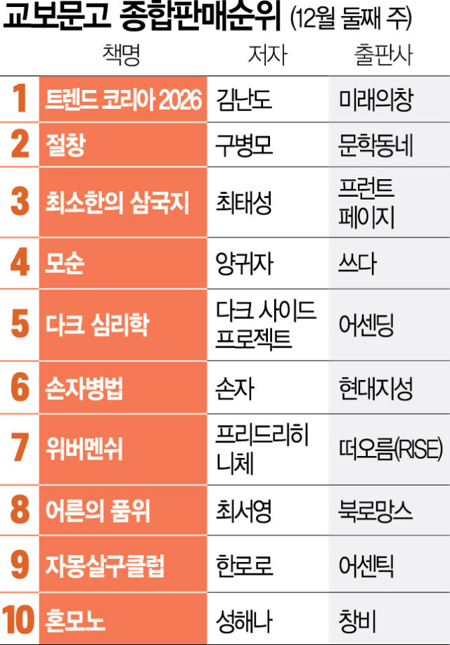 [정보]교보문고 12월 둘째주 베스트셀러 순위 작성자서울스날|작성시간25.12.15|조회수6,582 목록 댓글 11 글자크기 작게가 글자크기 크게가 '트렌드 코리아' 11주 연속 1위최태성 신간 '최소한의 삼국지' 지난주 20위 → 3위 점프 다음검색 현재 게시글 추가 기능 열기 북마크 공유하기 신고 센터로 신고 댓글 댓글 11 댓글쓰기 답글쓰기 댓글 리스트 작성자흥민쓰 | 작성시간 25.12.15 최소한의 삼국지 재밌음ㅋ큰별쌤 음성이 들림ㅋㅋ 작성자정예린 | 작성시간 25.12.16 작성자산티아고베르나베우 | 작성시간 25.12.16 트코를 매번 챙겨보는게 신기하네 ㅋㅋㅋ 구냥 키워드만 대충봐도 되는데 작성자오스카 아이작 | 작성시간 25.12.16 절창 너무 안읽혀서 30프로 읽다가 포기함 작성자오레오레오 | 작성시간 25.12.16 트코가 볼만한 책인가요? 댓글 전체보기