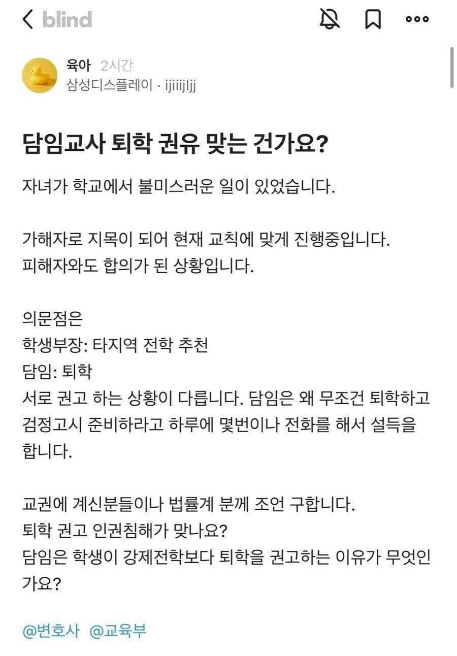 작성자서현진 작성시간 25.12.23 맥락상 퇴학이 아니라 자퇴 권고인거 같은데 다른 학교가도 부적응할거 같으니 학생을 위해서라면 자퇴 후 검정고시가 낫다고 생각하신거겠지