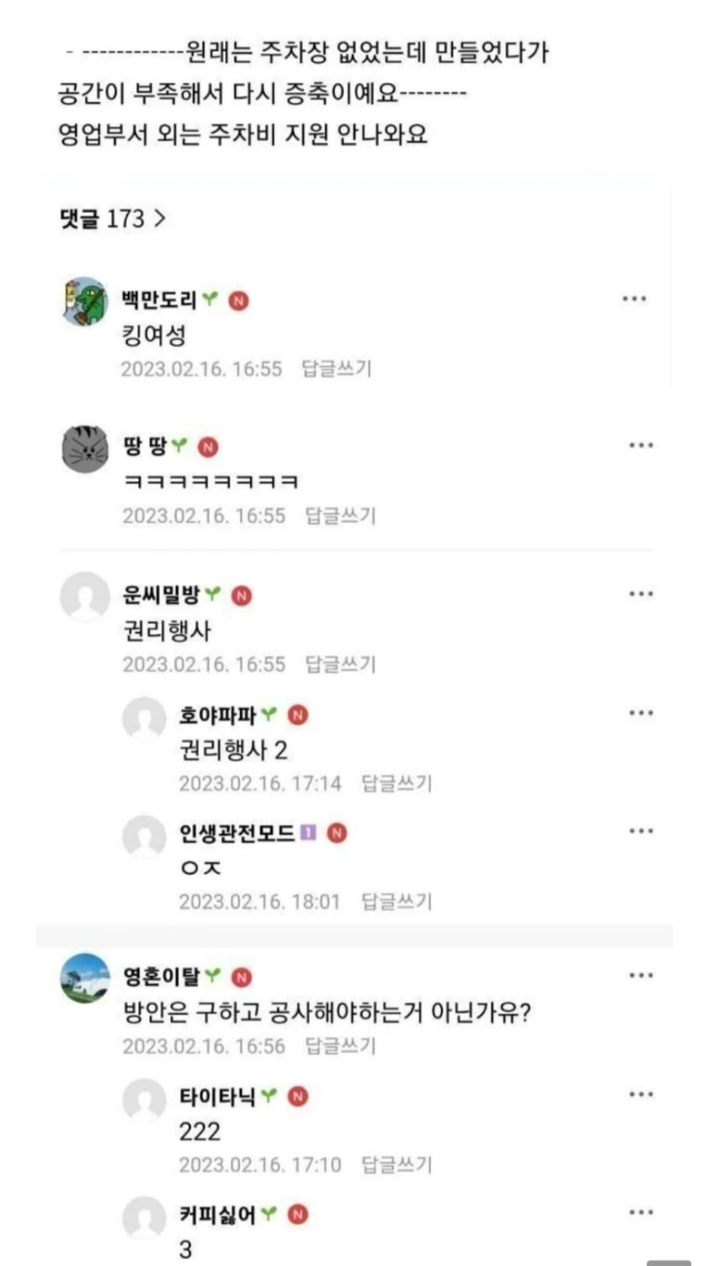 작성자서울서포터 작성시간 25.12.24 육휴는 못 막으니 그걸로 뭐라할건 아니고 주차비는 당연한건 아닌거 같은데. 해주면 좋고 아님 어쩔수없고 아닌가. 당연 대책마련해주면 좋지만 아니라도 뭐라할 사항은 아닌거 같은데