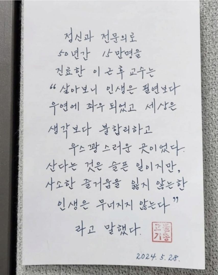 [기타]정신과 의사가 남긴말.jpg 작성자강동구주민 3|작성시간25.12.24|조회수47,624 목록 댓글 9 글자크기 작게가 글자크기 크게가 다음검색 현재 게시글 추가 기능 열기 북마크 공유하기 신고 센터로 신고 댓글 댓글 9 댓글쓰기 답글쓰기 댓글 리스트 작성자아무나2 | 작성시간 25.12.25 훔치고 싶은 글씨체네요.정말 잘 쓰시네요 작성자I’d rather be ashes than dust | 작성시간 25.12.25 도파민을 계속 유지해야 하는건가 ㅜ 작성자채화 | 작성시간 25.12.25 ㅠ 위로가되네요 작성자이기사 | 작성시간 26.01.22 백퍼 공감~ 작성자샴페인 | 작성시간 26.01.28 너무 공감가고 무겁습니다 댓글 전체보기