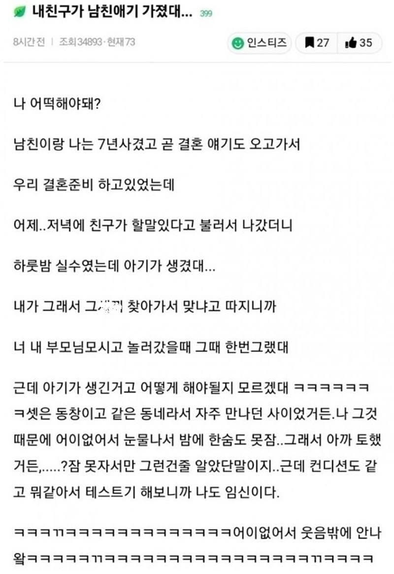 내 친구가 내 남친 애기 가졌대 작성자가을날4|작성시간25.12.25|조회수11,398 목록 댓글 14 글자크기 작게가 글자크기 크게가 다음검색 현재 게시글 추가 기능 열기 북마크 공유하기 신고 센터로 신고 댓글 댓글 14 댓글쓰기 답글쓰기 댓글 리스트 작성자Solaris | 작성시간 25.12.25 너무 주작 냄새 작성자마이너스템포 | 작성시간 25.12.25 양쪽에서 바빴네 아주 작성자디지몬 | 작성시간 25.12.25 안읽었는데 인스티즈라 구라일듯 작성자빈이 | 작성시간 25.12.25 뭐 믿지도 않는다만어디 저기 시골 똥개여? ㅋㅋㅋ 작성자PinkMoon | 작성시간 25.12.25 마지막에 주작 확정지어주네 ㅋㅋ 저상황에서 웃으면 진짠줄 알거라 생각하나 댓글 전체보기