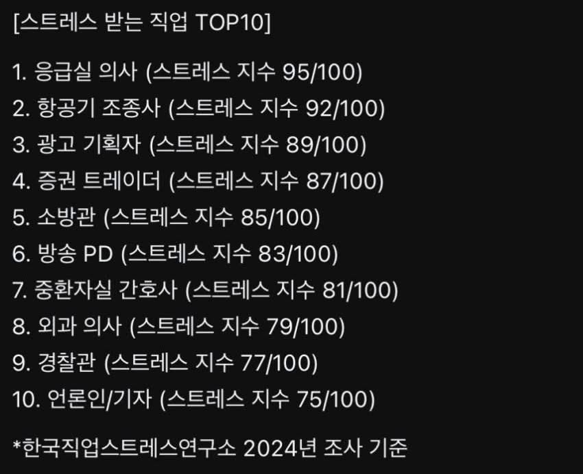 스트레스 많이 받는 직업 작성자가을날4|작성시간25.12.26|조회수22,802 목록 댓글 24 글자크기 작게가 글자크기 크게가 다음검색 현재 게시글 추가 기능 열기 북마크 공유하기 신고 센터로 신고 댓글 댓글 24 댓글쓰기 답글쓰기 댓글 리스트 작성자채화 | 작성시간 25.12.26 그냥 모든게 다 힘듦ㅠㅠ 작성자I.B.I LUV | 작성시간 25.12.26 기자는 아니야 작성자밀키스 | 작성시간 25.12.26 항공기조종사는 운전이 어려워서그런가 작성자중고차파괴자 | 작성시간 25.12.26 보호자+환자+동료+불규칙한 업무환경+급박한 상황진짜 일하다가 성격다버림 작성자Bad to the Bone | 작성시간 25.12.28 특수교사는? 댓글 전체보기