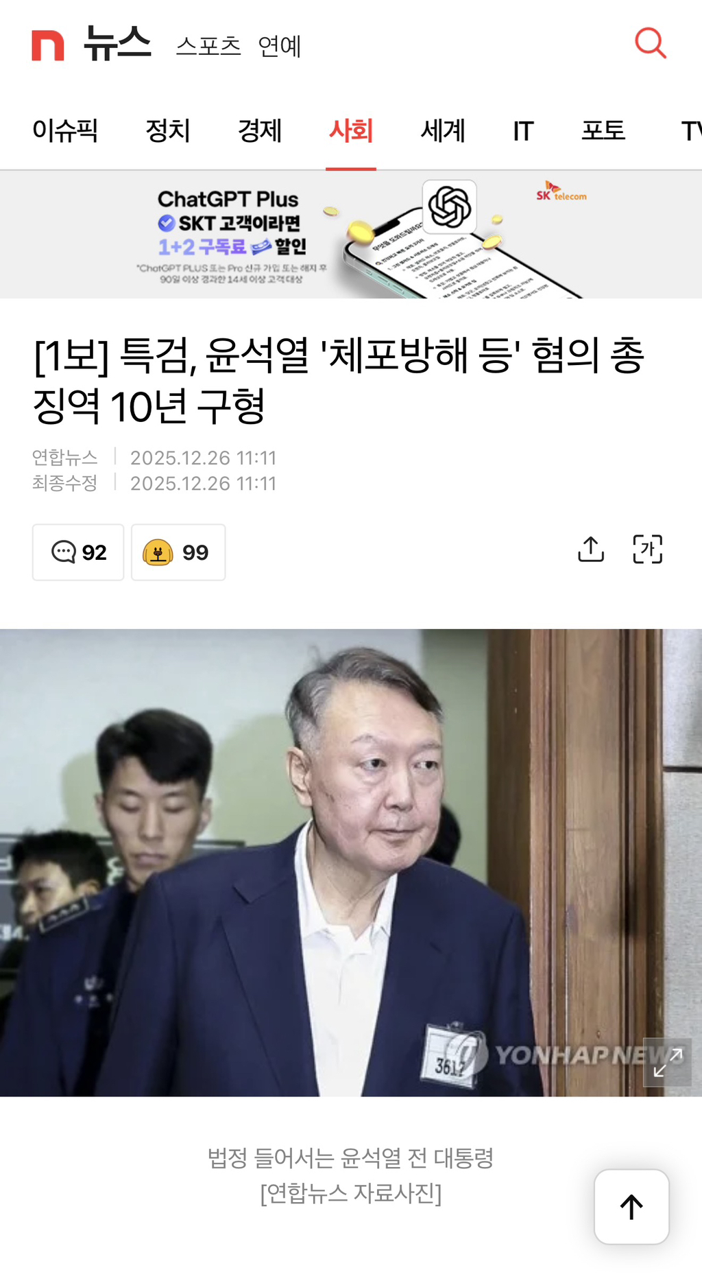 [기사][1보] 특검, 윤석열 '체포방해 등' 혐의 총 징역 10년 구형 작성자윤채경|작성시간25.12.26|조회수3,937 목록 댓글 46 글자크기 작게가 글자크기 크게가 https://m.news.nate.com/view/20251226n10446?[1보] 특검, 윤석열 '체포방해 등' 혐의 총 징역 10년 구형 : 네이트 뉴스한눈에 보는 오늘 : 사회 - 뉴스 : (끝) [이 시각 많이 본 기사]☞ 정희원, '스토킹 신고' 여성에 문자…"후회한다, 죄송하다"☞ 남양주 노래방서 여성 종업원 망치로 폭행한 50대 남성 검거☞ [샷!] "m.news.nate.com 다음검색 현재 게시글 추가 기능 열기 북마크 공유하기 신고 센터로 신고 댓글 댓글 46 댓글쓰기 답글쓰기 댓글 리스트 작성자아지랑이 | 작성시간 25.12.26 검찰 구형일뿐이라서 사법부 양형을 봐야할테고, 항소항고하면 수년은 지난뒤에야 결정되겠죠. 작성자추꾸죠아 | 작성시간 25.12.26 이것저것 깎여도 체포방해만으로도 실형이겠구만 작성자중고차파괴자 | 작성시간 25.12.26 ㅋㅋㅋ그냥 조용히갔으면 될것을 작성자오표시무해 | 작성시간 25.12.26 얜 어차피 최소 무기징역이라 ㅋㅋ 작성자수원블루맨1 | 작성시간 25.12.26 내란특별재판부에서 다시 재판을 해서 무조건 사형으로 가야죠~ 댓글 전체보기