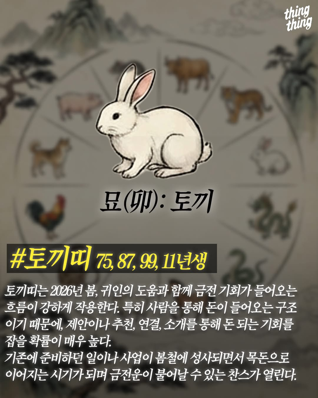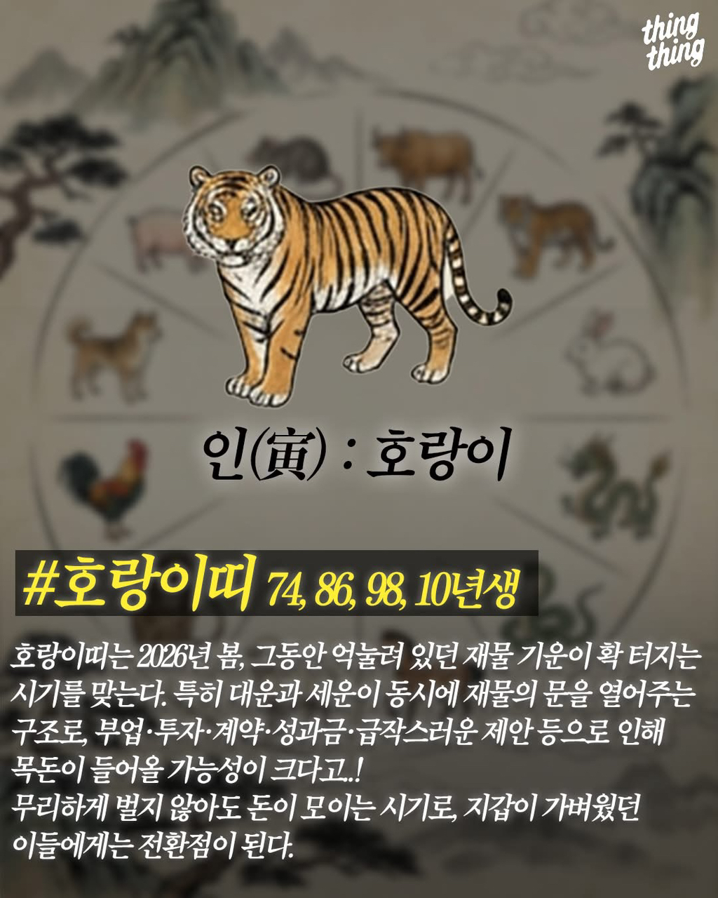 재미로 보는 2026년 금전운 대박 띠 작성자가을날4|작성시간25.12.26|조회수3,943 목록 댓글 6 글자크기 작게가 글자크기 크게가 출처 띵띵 다음검색 현재 게시글 추가 기능 열기 북마크 공유하기 신고 센터로 신고 댓글 댓글 6 댓글쓰기 답글쓰기 댓글 리스트 답댓글 작성자윤태진 | 작성시간 25.12.26 뛰는 호랑이 앞에 나는 쥐 ㄷㄷ 작성자뽀무빵삑 | 작성시간 25.12.26 크어억 금전운 쥑인다!! 작성자디발라 | 작성시간 25.12.26 부럽다 작성자Clarence Seedorf | 작성시간 25.12.26 재물의운이 터지는구나 작성자성남전위대장 | 작성시간 25.12.26 소띠는 왜없어??? 댓글 전체보기