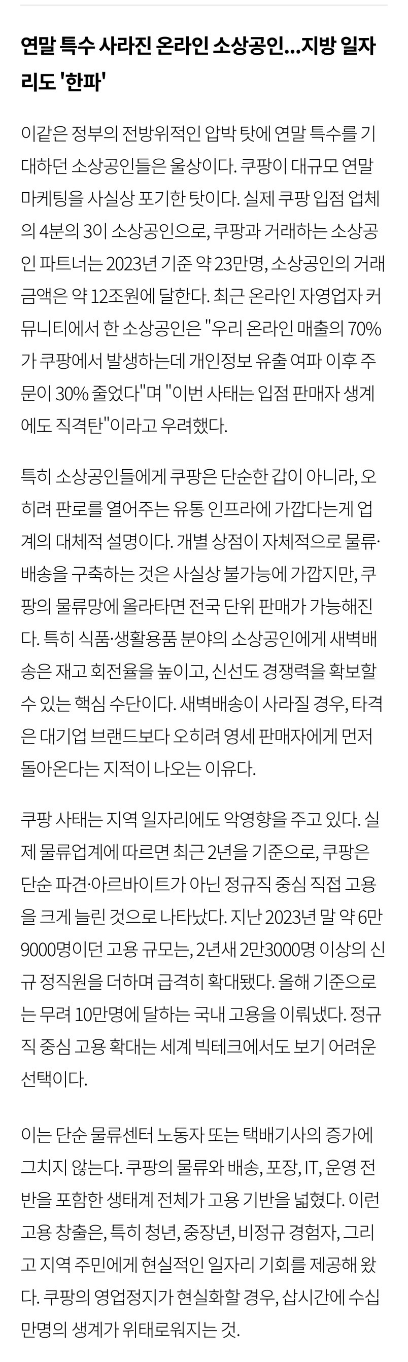 [기사]쿠팡 악마화에 물류-유통업 비상 걸렸다 작성자solid|작성시간25.12.27|조회수8,219 목록 댓글 31 글자크기 작게가 글자크기 크게가 https://www.techm.kr/news/articleView.html?idxno=148074[테크M 이슈] '쿠팡 죽이기'의 끝은 고용붕괴? 쿠팡 악마화에 물류-유통업 비상 걸렸다 - 테크M쿠팡이 자체조사를 통한 개인정보 유출 현황을 공표, 사태수습에 공을 들이고 있지만 정부와 여당의 쿠팡 옥죄기 행보는 연일 거세지는 양상이다. 올들어 국내에서 가장 많은 고용을 이뤄낸 쿠www.techm.kr 다음검색 현재 게시글 추가 기능 열기 북마크 공유하기 신고 센터로 신고 댓글 댓글 31 댓글쓰기 답글쓰기 댓글 리스트 작성자엠비션주장 | 작성시간 25.12.27 진짜 기자가 조사좀 받아야할수준인데..? 작성자아재씨 | 작성시간 25.12.27 악마자너ㅋㅋㅋ 작성자코징이 | 작성시간 25.12.27 뭐래 작성자넥슨 | 작성시간 25.12.27 ㅗ 작성자jennie | 작성시간 25.12.27 악마“화”? 댓글 전체보기