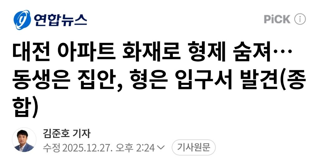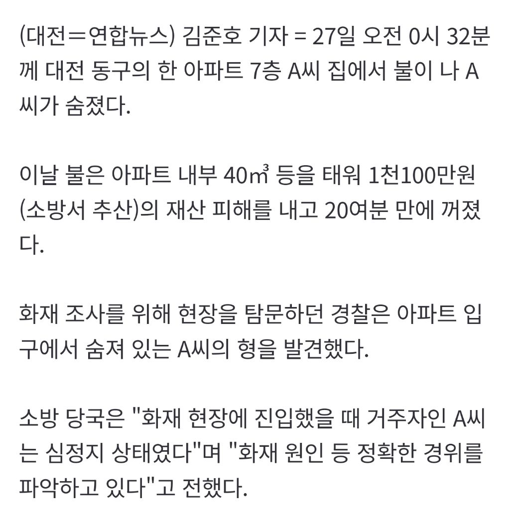 [기사]대전 아파트 화재로 형제 숨져…동생은 집안, 형은 입구서 발견(종합).gisa 작성자강동구주민 3|작성시간25.12.27|조회수8,834 목록 댓글 11 글자크기 작게가 글자크기 크게가 대전 아파트 화재로 형제 숨져…동생은 집안, 형은 입구서 발견(종합)27일 오전 0시 32분께 대전 동구의 한 아파트 7층 A씨 집에서 불이 나 A씨가 숨졌다. 이날 불은 아파트 내부 40㎥ 등을 태워 1천100만원(소방서 추산)의 재산 피해를 내고 20여분 만에 꺼졌다. 화재 조n.news.naver.com 다음검색 현재 게시글 추가 기능 열기 북마크 공유하기 신고 센터로 신고 댓글 댓글 11 댓글쓰기 답글쓰기 댓글 리스트 작성자서현진 | 작성시간 25.12.27 ㅠㅠ 작성자롭슨 | 작성시간 25.12.27 ㅜㅜ 작성자김바덕 | 작성시간 25.12.27 아.. ㅠㅠ 작성자RedDevils | 작성시간 25.12.27 ㅠㅠ 작성자트렌트 알렉산더 아놀드66 | 작성시간 25.12.28 아고.....ㅜㅜ 댓글 전체보기