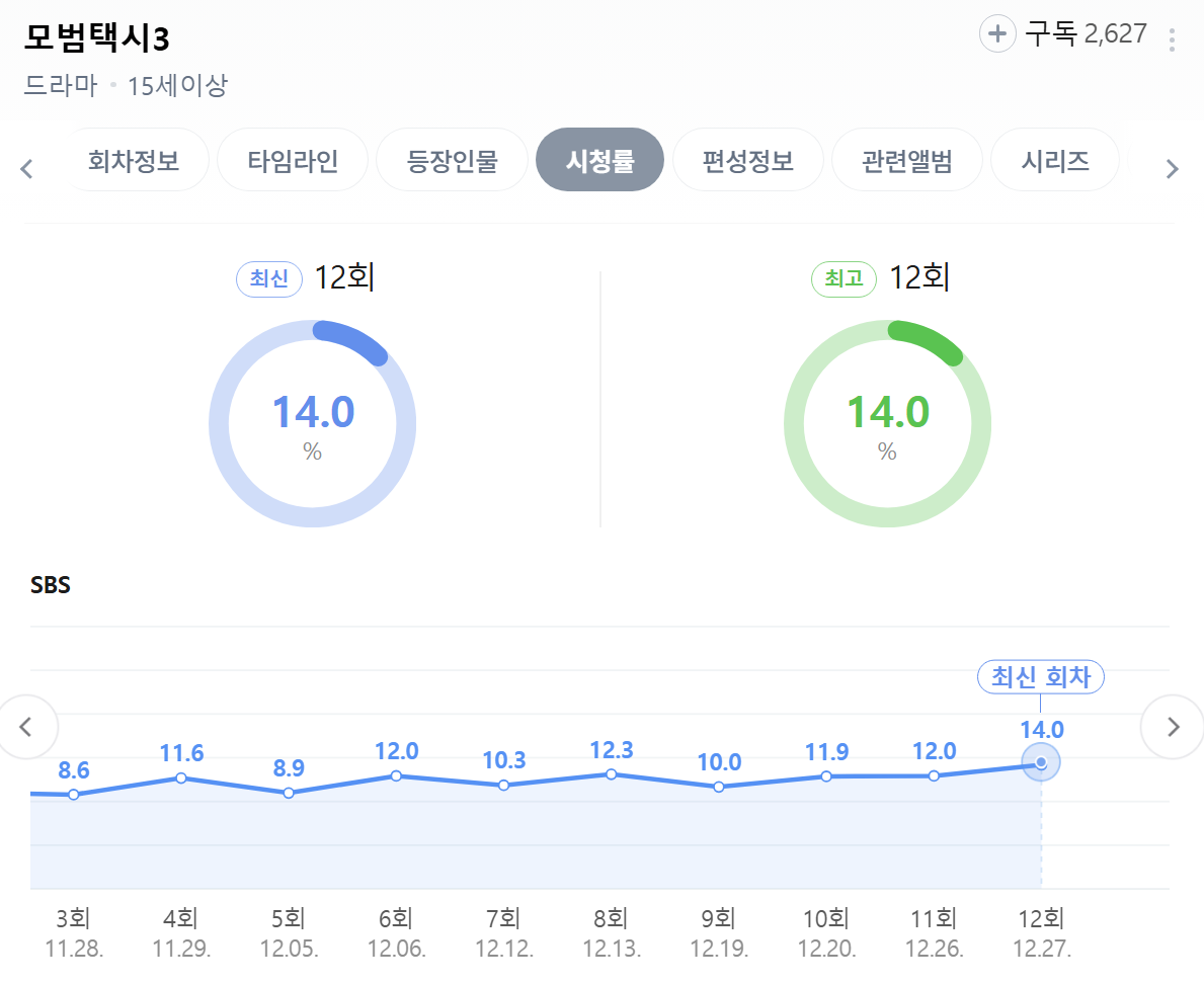 [방송]SBS '모범택시 3' 시청률 추이 작성자서울스날|작성시간25.12.29|조회수5,522 목록 댓글 15 글자크기 작게가 글자크기 크게가 12회 자체 최고 (13-14화 빌런 김성규)16부작 다음검색 현재 게시글 추가 기능 열기 북마크 공유하기 신고 센터로 신고 댓글 댓글 15 댓글쓰기 답글쓰기 댓글 리스트 작성자께께오톡 | 작성시간 25.12.29 다음주면 드디어 몰아볼 수 있겠구만 작성자우상향 | 작성시간 25.12.29 꿀잼 누구들이 발짝 하니까 더 꿀잼 작성자카리나Kirina | 작성시간 25.12.29 꿀잼 작성자데니스 코펜하겐 | 작성시간 25.12.29 중간 중간 어디 까는거 나와서 더 꿀잼ㅋㅋ 작성자오다기리 죠 | 작성시간 25.12.30 오글거려서 못봐용 댓글 전체보기