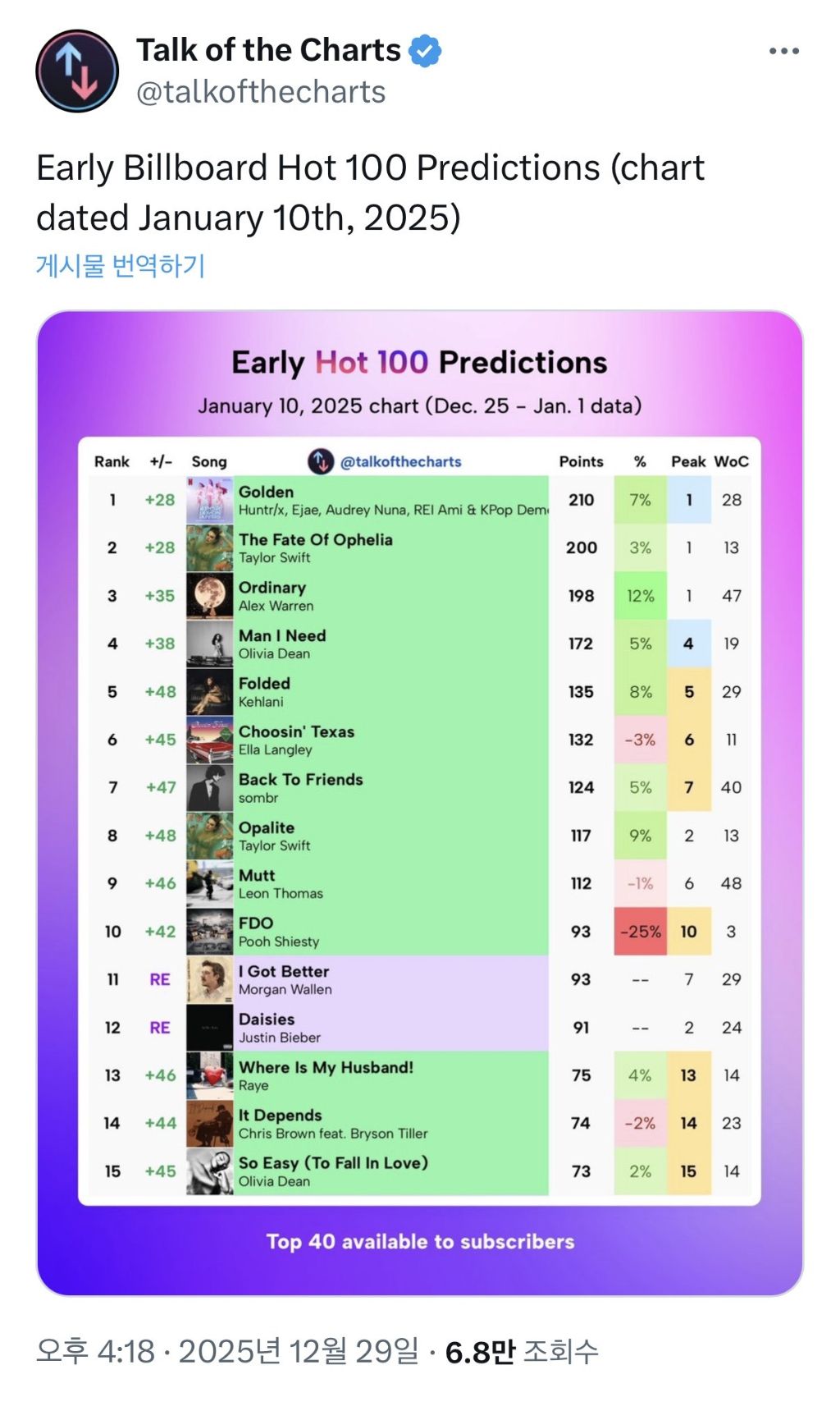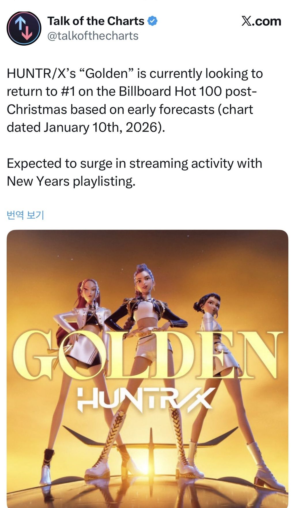다음주 빌보드 핫백 1위 예측 뜬 케데헌 골든 작성자Hailee Steinfeld|작성시간25.12.29|조회수3,386 목록 댓글 11 글자크기 작게가 글자크기 크게가 다음검색 현재 게시글 추가 기능 열기 북마크 공유하기 신고 센터로 신고 댓글 댓글 11 댓글쓰기 답글쓰기 댓글 리스트 작성자페더스 맥그로우 | 작성시간 25.12.29 이미지 확대 작성자https://m.cafe.daum.net/rocksoccer | 작성시간 25.12.29 ????????? 작성자맛있는 고로케 | 작성시간 25.12.29 ㄷㄷㄷㄷ 작성자아일릿 | 작성시간 25.12.30 크리스마스땐 잠깐 양보한기분이네 ㅋㅋㅋㅋㅋ 작성자유튜부 | 작성시간 25.12.30 진짜 미친거 아닌가.. 댓글 전체보기