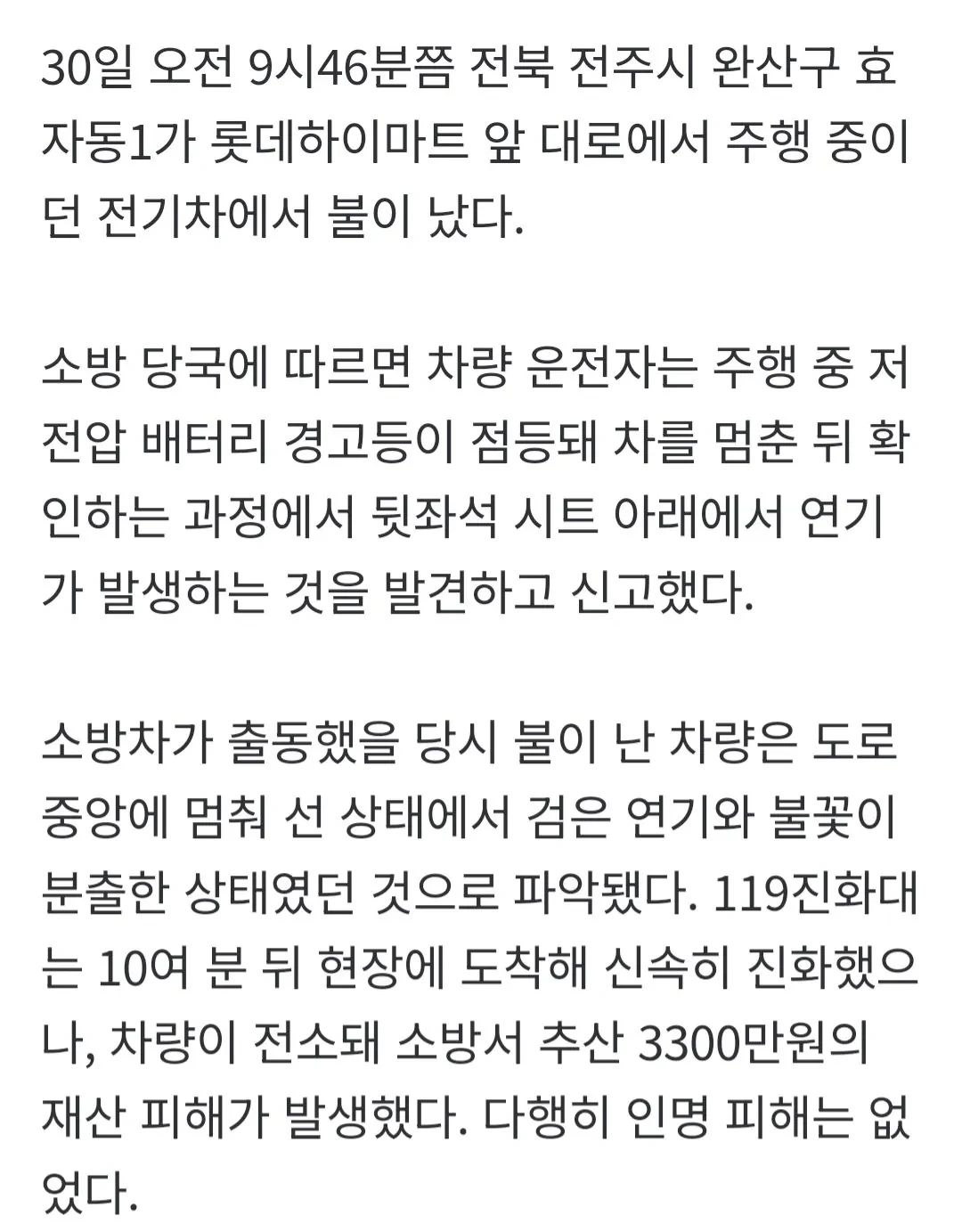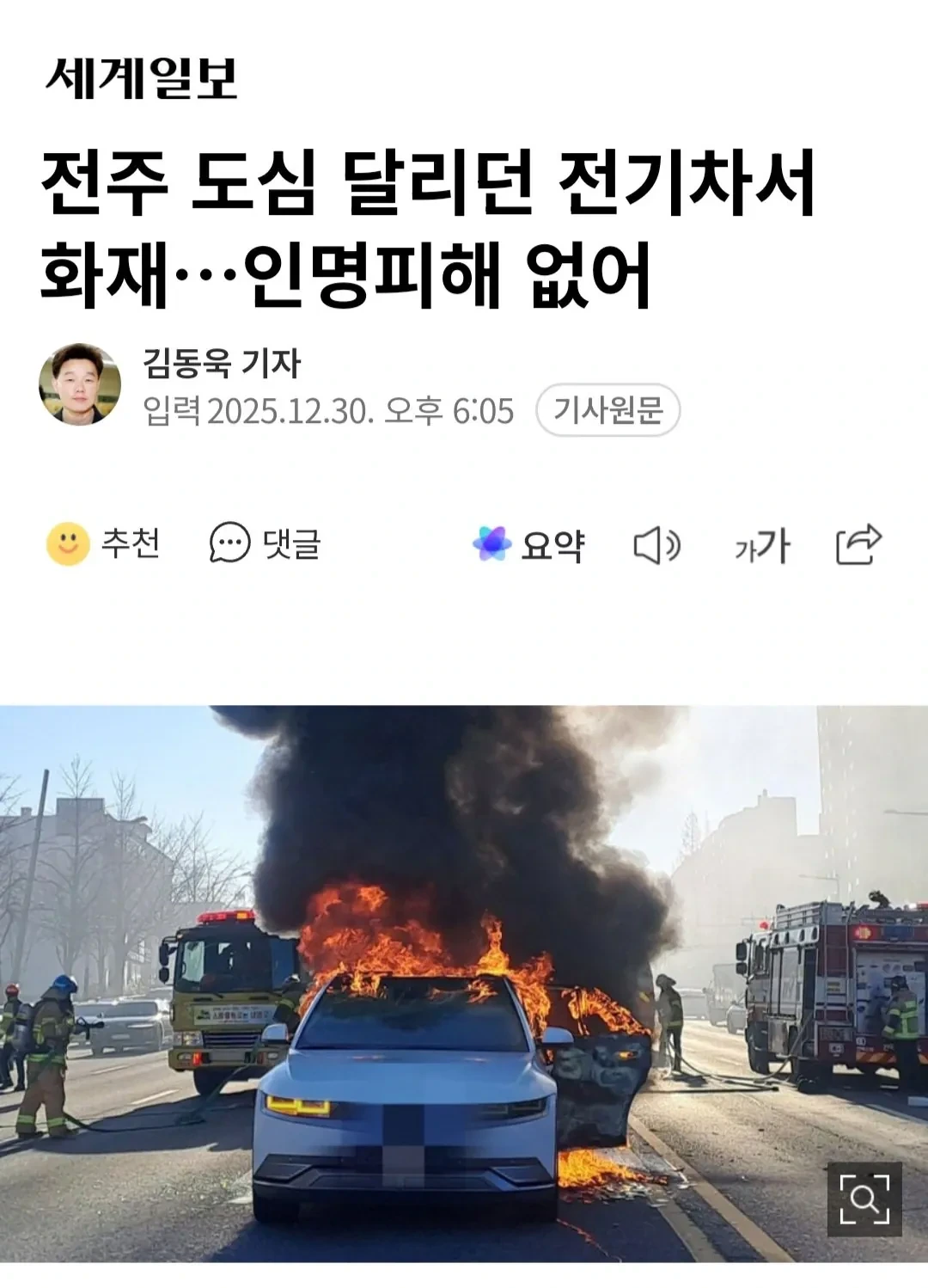 [기사]전주 도심 달리던 전기차서 화재…인명피해 없어 작성자rade bogdanovic|작성시간25.12.30|조회수3,037 목록 댓글 5 글자크기 작게가 글자크기 크게가 다음검색 현재 게시글 추가 기능 열기 북마크 공유하기 신고 센터로 신고 댓글 댓글 5 댓글쓰기 답글쓰기 댓글 리스트 작성자추아메니 | 작성시간 25.12.30 아이오닉5인가 작성자정예린 | 작성시간 25.12.30 다친사람 없다니 다행 작성자우주 | 작성시간 25.12.30 또 그 현기 iccu 결함때문인가? 작성자우와왕 | 작성시간 25.12.30 현기는 회사명 안나오네 ㅋㅋ 테슬라였으면 모델명까지 나왔을텐데 작성자권석진 | 작성시간 25.12.30 근데 뒤로 굴러도 아이오닉5 ㅋㅋㅋㅋㅋ 댓글 전체보기
