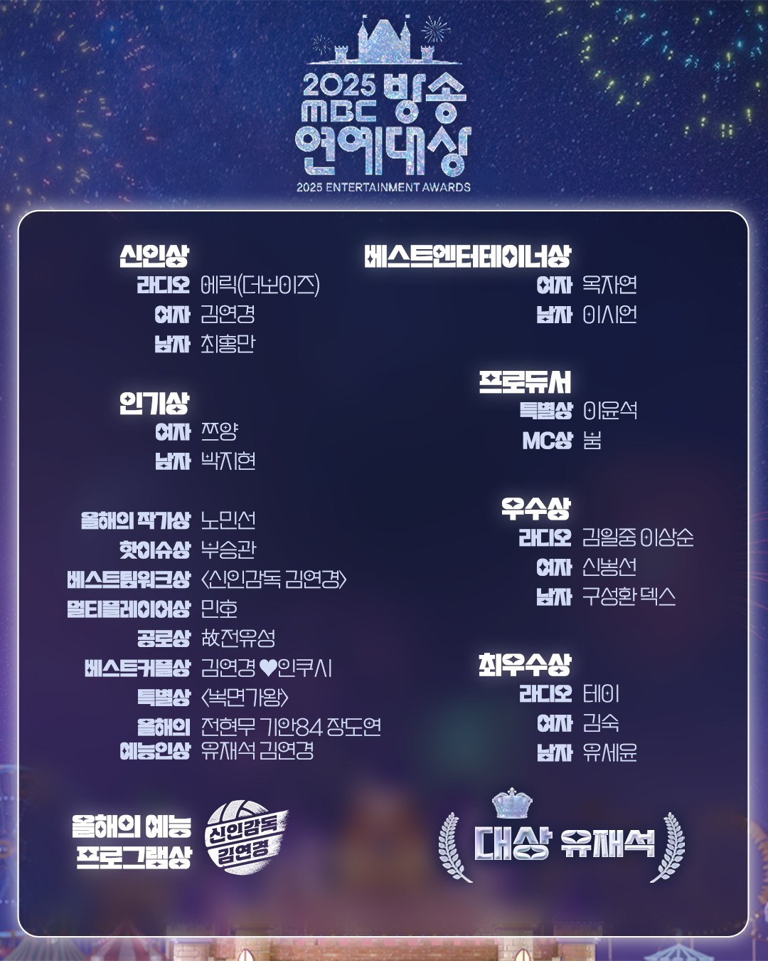 [연예]2025 MBC 연예대상 수상 결과.jpg 작성자탱구|작성시간25.12.31|조회수2,708 목록 댓글 7 글자크기 작게가 글자크기 크게가 다음검색 현재 게시글 추가 기능 열기 북마크 공유하기 신고 센터로 신고 댓글 댓글 7 댓글쓰기 답글쓰기 댓글 리스트 작성자H_Crespo | 작성시간 25.12.31 역시 유느님~ 작성자Astros | 작성시간 25.12.31 왜 유재석이지.. 놀뭐 시청률도 안좋은데 작성자전문키커 이세은★ | 작성시간 25.12.31 멀티플레이어상은 뭐임??? 답댓글 작성자I.B.I LUV | 작성시간 25.12.31 그냥 전형적인 구색 맞추기 용인듯.. 작성자고우림 | 작성시간 25.12.31 신비한 티비 서프라이즈도 챙겨주지 아쉽군 댓글 전체보기