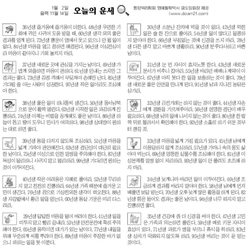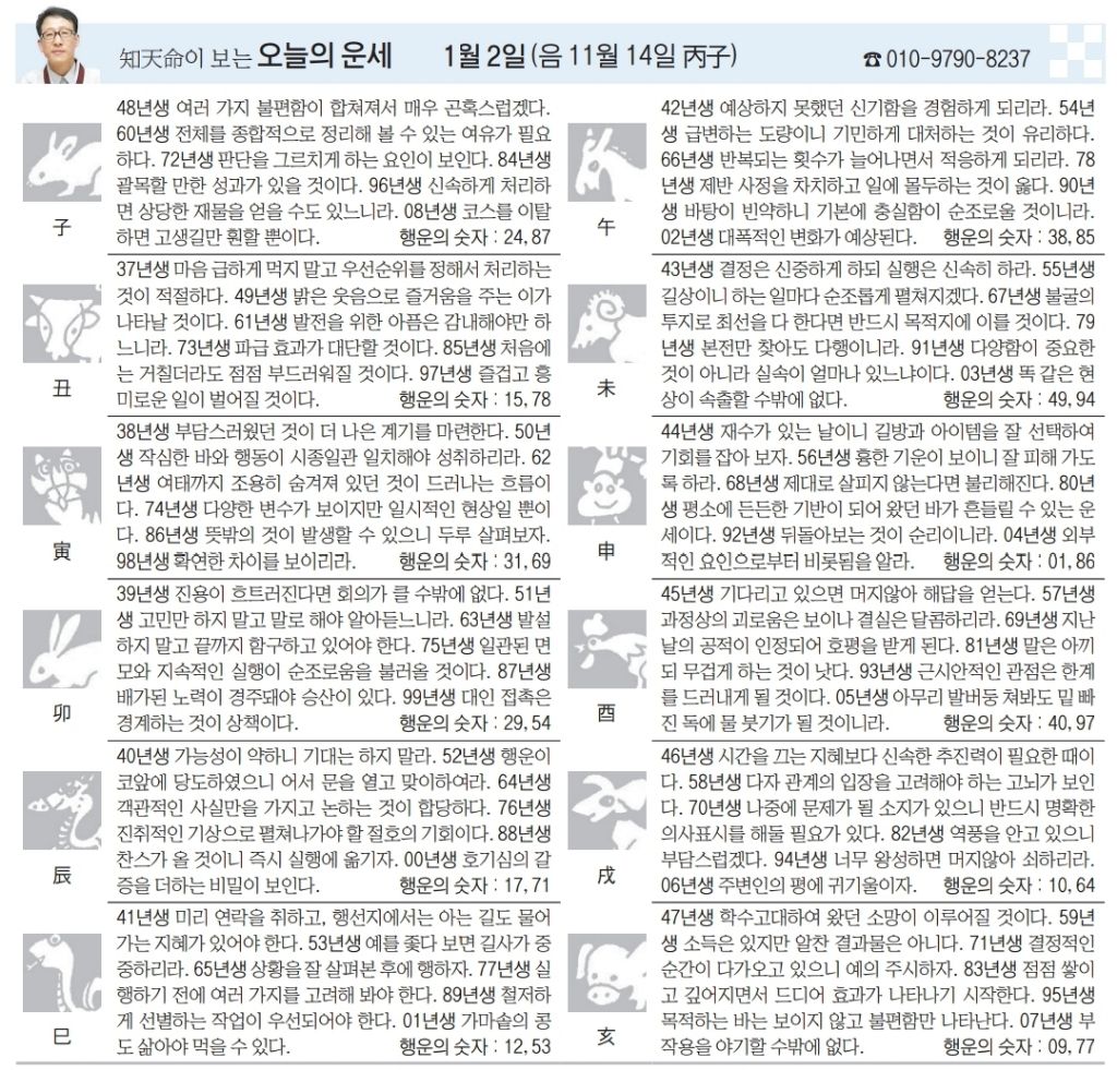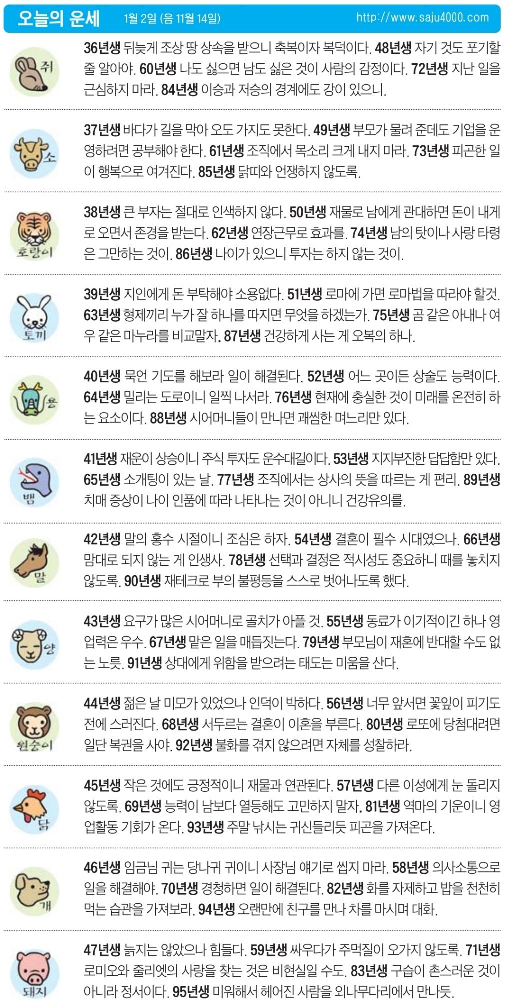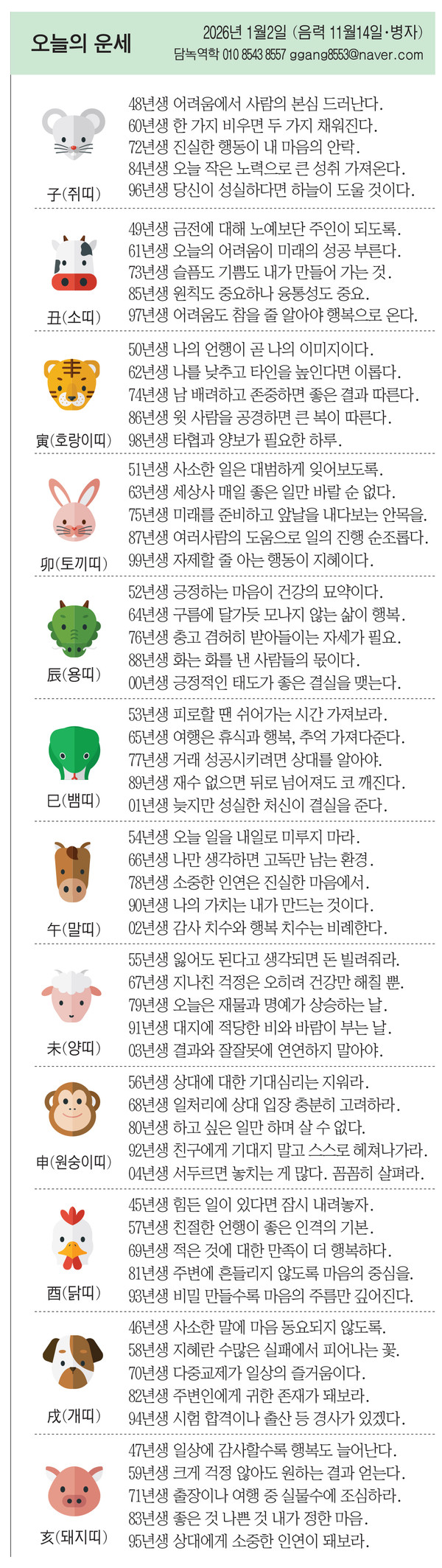 1월 2일 금요일 오늘의 운세 작성자난누군가또여긴어딘가.|작성시간26.01.02|조회수2,691 목록 댓글 12 글자크기 작게가 글자크기 크게가 다음검색 현재 게시글 추가 기능 열기 북마크 공유하기 신고 센터로 신고 댓글 댓글 12 댓글쓰기 답글쓰기 댓글 리스트 작성자5홉니다 | 작성시간 26.01.02 복채요~ 작성자정예린 | 작성시간 26.01.02 복채요 작성자수원블루맨1 | 작성시간 26.01.02 복채요 작성자Amier | 작성시간 26.01.02 복채요 작성자Andrea Pirlo 21 | 작성시간 26.01.02 복채요! 댓글 전체보기