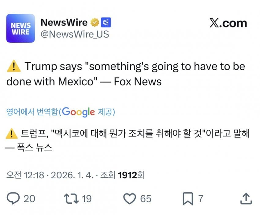 작성자령채 작성시간 26.01.04 마약, 불법이민자 문제로 생각하면 베네수엘라보다 멕시코의 더 영향이 훨씬 크기도 하고 원래부터 얘기해온 것도 멕시코였긴해서....