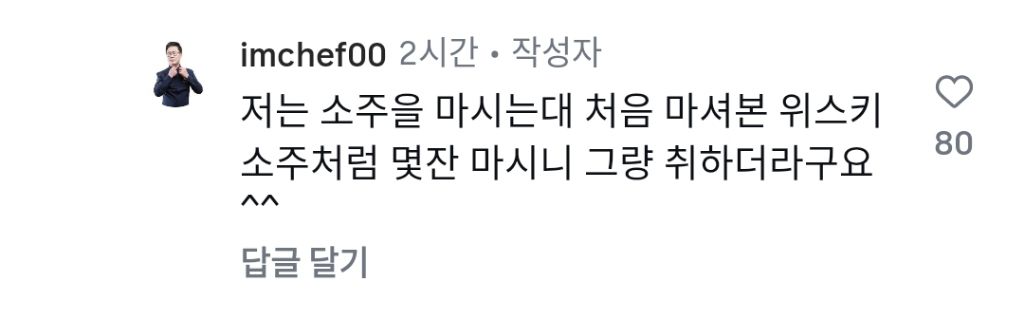 사실 위스키 처음 마셔봤다는 임짱 임성근 셰프 작성자러바오|작성시간26.01.04|조회수11,423 목록 댓글 10 글자크기 작게가 글자크기 크게가 다음검색 현재 게시글 추가 기능 열기 북마크 공유하기 신고 센터로 신고 댓글 댓글 10 댓글쓰기 답글쓰기 댓글 리스트 작성자신해철 | 작성시간 26.01.04 발베니를 정말 소주처럼 드시던데 ㅋㅋㅋㅋㅋ 작성자인천제로콜라 | 작성시간 26.01.04 ㅋㅋㅋㅋㅋㅋㅋ 구사리 ㅋㅋㅋ 작성자김묘성 | 작성시간 26.01.04 ㅋㅋㅋㅋㅋㅋㅋㅋㅋㅋㅋㅋㅋ 작성자심수봉 | 작성시간 26.01.04 머 실수하셧나요? 답댓글 작성자오스카 아이작 | 작성시간 26.01.04 실수하신거 없어요ㅋㅋㅋㅋㅋ 댓글 전체보기