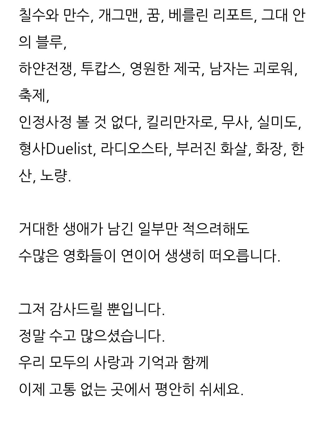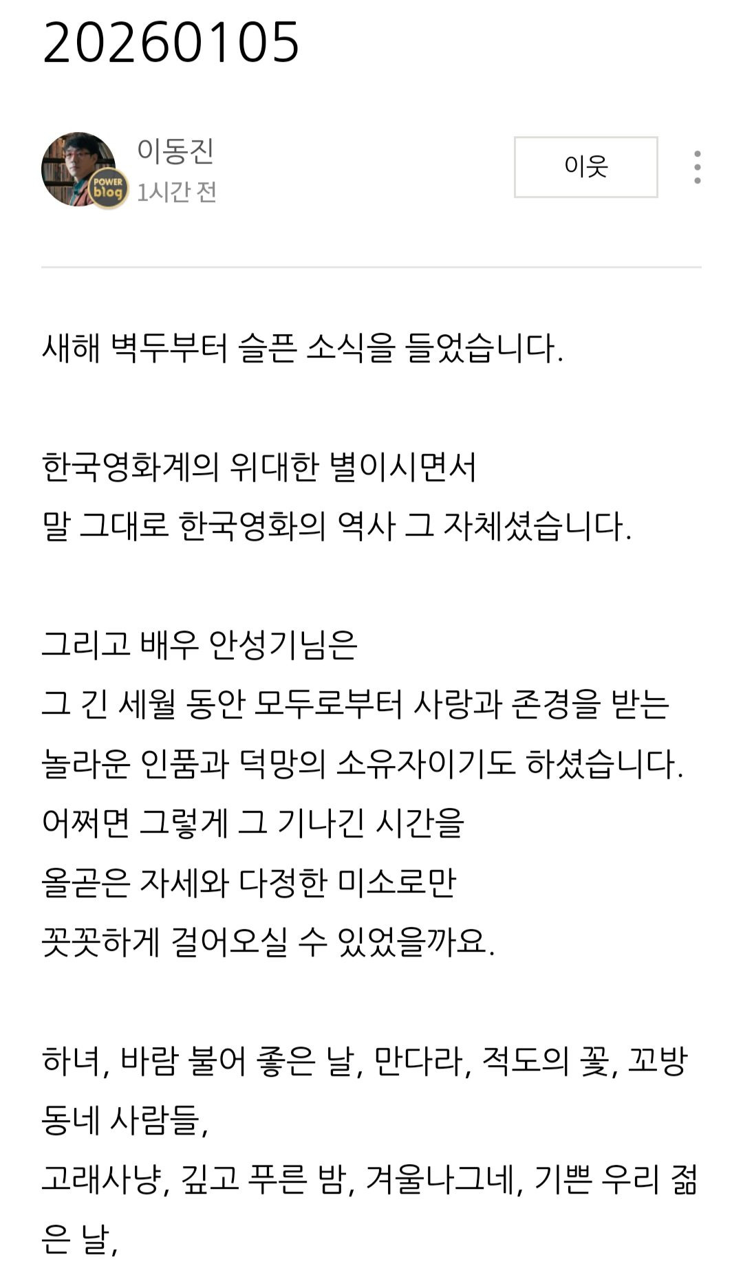 [영화]이동진 평론가의 배우 안성기 추모글 작성자음교수2|작성시간26.01.05|조회수4,763 목록 댓글 1 글자크기 작게가 글자크기 크게가 다음검색 현재 게시글 추가 기능 열기 북마크 공유하기 신고 센터로 신고 댓글 댓글 1 댓글쓰기 답글쓰기 댓글 리스트 작성자데이빗베컴이 | 작성시간 26.01.05 삼가 고인의 명복을 빕니다. 댓글 전체보기